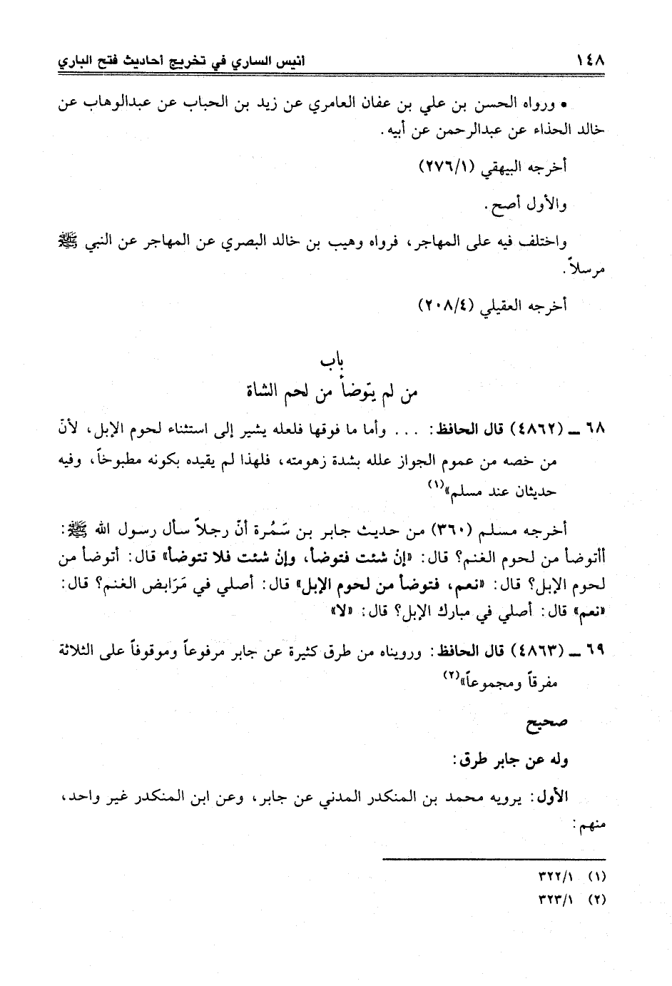 68 - (4862) قال الحافظ: ... وأما ما فوقها فلعله يثير إلى استثناء لحوم الإبل؛ لأنّ من خصه من عموم الجواز علله بشدة زهومته، فلهذا لم يقيده بكونه مطبوخاً، وفيه حديثان عند مسلم" (¬1)