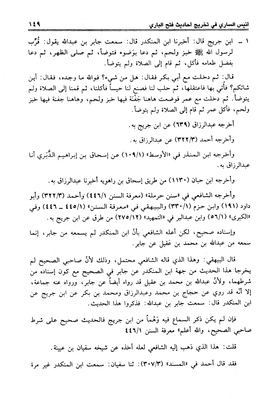 1 - ابن جريج قال: أخبرنا ابن المنكدر قال: سمعت جابر بن عبد الله يقول: قُرِّب لرسول الله -صلى الله عليه وسلم- خبز ولحم، ثم دعا بوَضوء فتوضأ، ثم صلى الظهر، ثم دعا بفضل طعامه فأكل، ثم قام إلى الصلاة ولم يتوضأ.