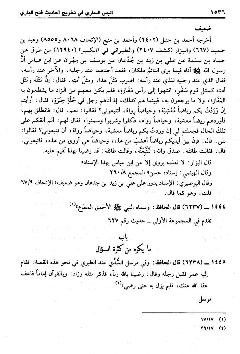 1445 - (6238) قال الحافظ: وفي مرسل السُّدِّي عند الطبري في نحو هذه القصة: فقام إليه عمر فقبل رجله وقال: رضينا بالله رباً، فذكر مثله وزاد: وبالقرآن إماماً فاعف عفا الله عنك، فلم يزل به حتى رضي" (¬2)