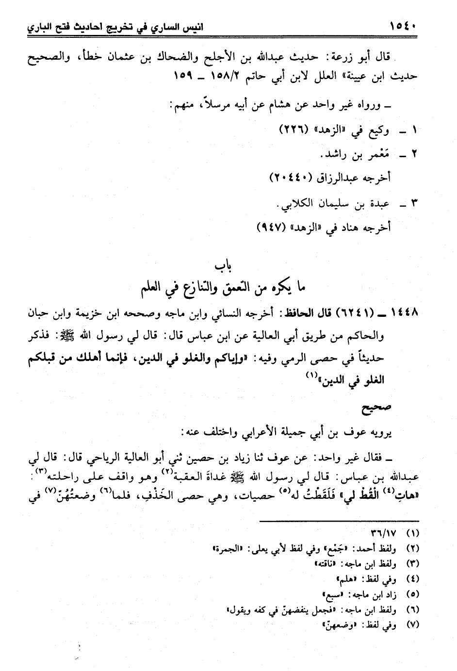 1448 - (6241) قال الحافظ: أخرجه النسائي وابن ماجه وصححه ابن خزيمة وابن حبان والحاكم من طريق أبي العالية عن ابن عباس قال: قال لي رسول الله -صلى الله عليه وسلم-: فذكر حديثاً في حصى الرمي وفيه: "وإياكم والغلو في الدين، فإنما أهلك من قبلكم الغلو في الدين" (¬1)