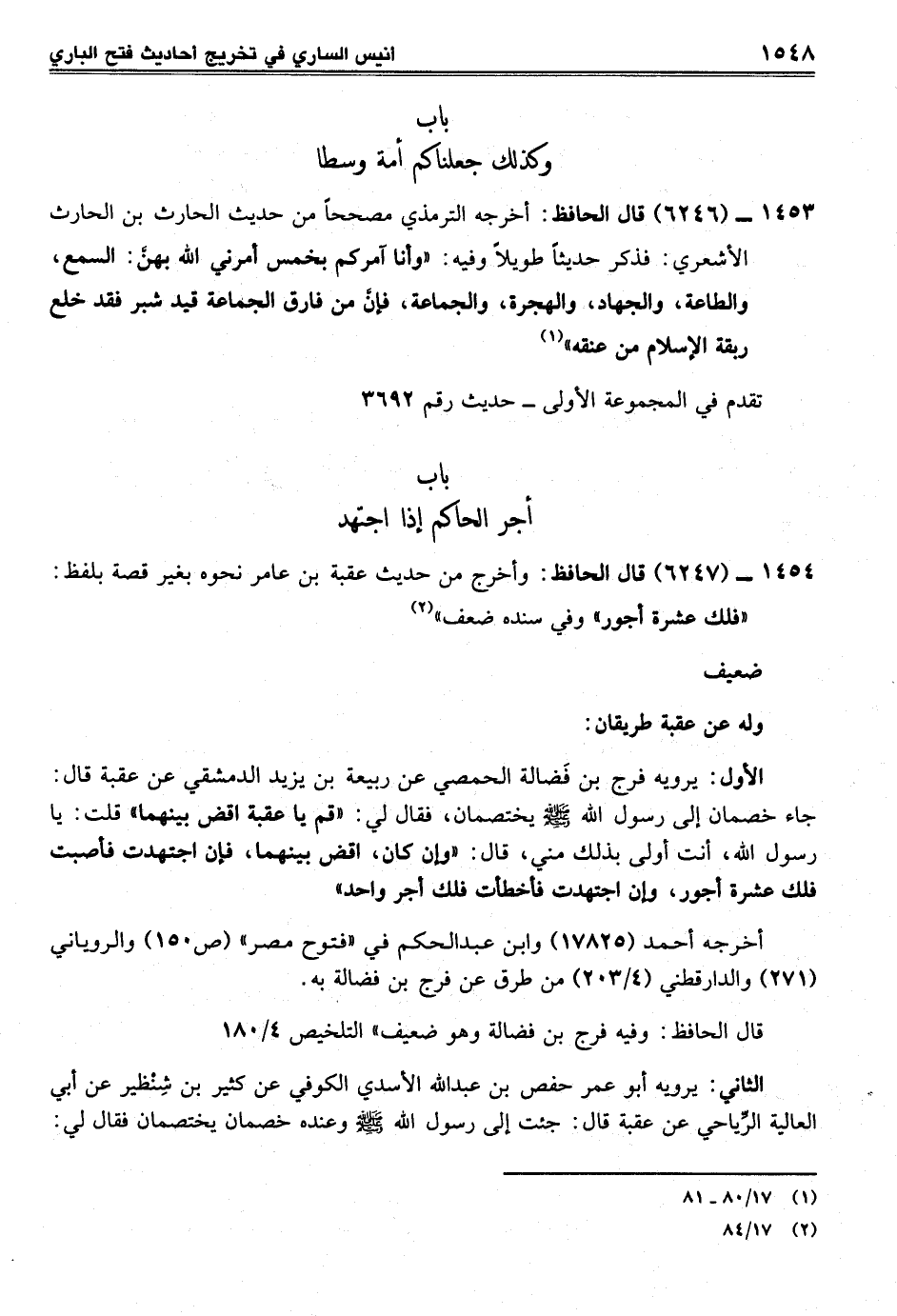 1454 - (6247) قال الحافظ: وأخرج من حديث عقبة بن عامر نحوه بغير قصة بلفظ: "ذلك عشرة أجور" وفي سنده ضعف" (¬2)