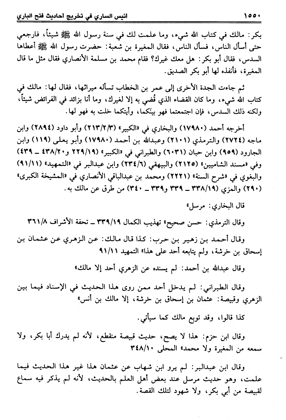 وقال ابن عبد البر: لم يرو ابن شهاب عن عثمان هذا غير هذا الحديث فيما علمت، وهو حديث مرسل عند بعض لكل العلم بالحديث، لأنه لم يذكر فيه سماع لقبيصة من أبي بكر، ولا شهود لتلك القصة.