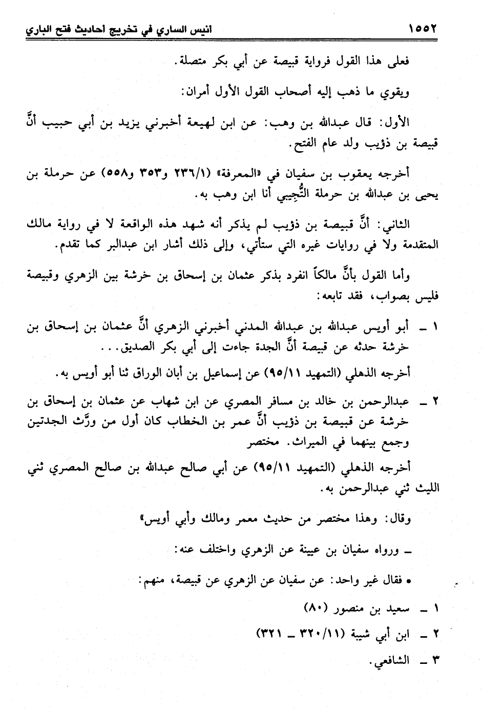 2 - عبد الرحمن بن خالد بن مسافر المصري عن ابن شهاب عن عثمان بن إسحاق بن خرشة عن قبيصة بن ذؤيب أنَّ عمر بن الخطاب كان أول من ورَّث الجدتين وجمع بينهما في الميراث. مختصر