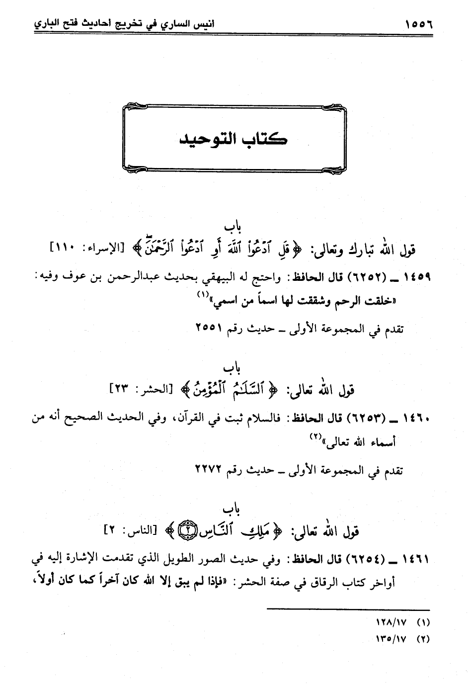 1460 - (6253) قال الحافظ: فالسلام ثبت في القرآن، وفي الحديث الصحيح أنه من أسماء الله تعالى" (¬2)