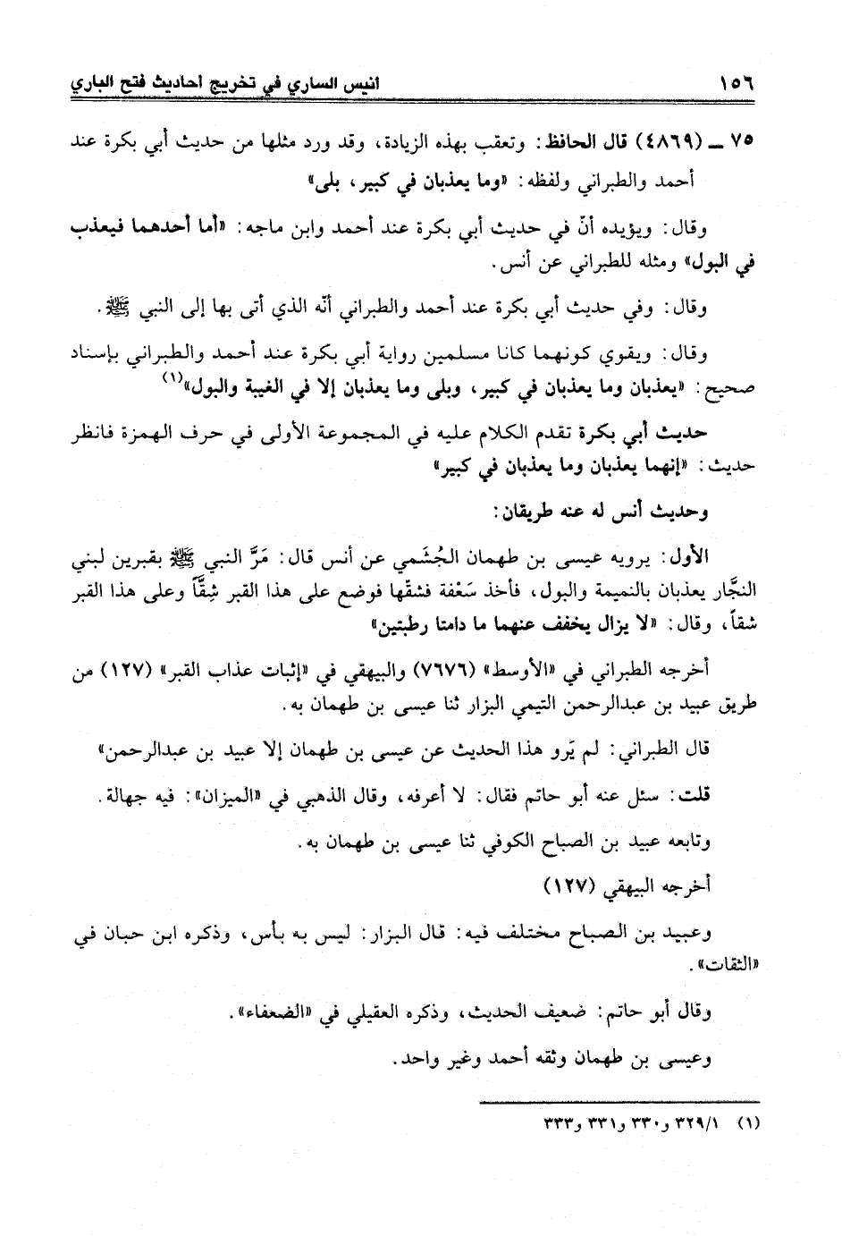 75 - (4869) قال الحافظ: وتعقب بهذه الزيادة، وقد ورد مثلها من حديث أبي بكرة عند أحمد والطبراني ولفظه: "وما يعذبان في كبير، بلى"