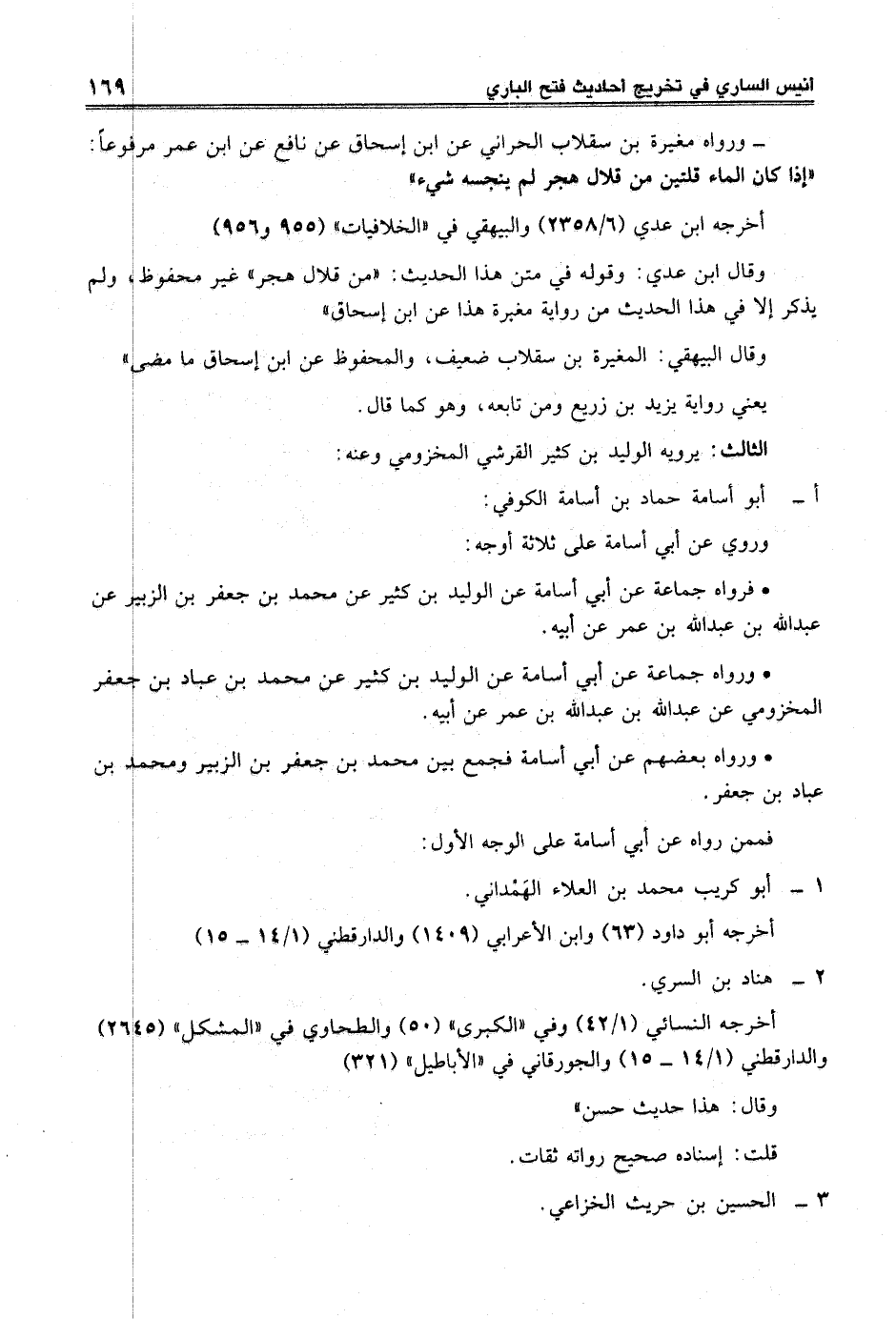 - ورواه مغيرة بن سقلاب الحراني عن ابن إسحاق عن نافع عن ابن عمر مرفوعاً: "إذا كان الماء قلتين من قلال هجر لم ينجسه شيء"