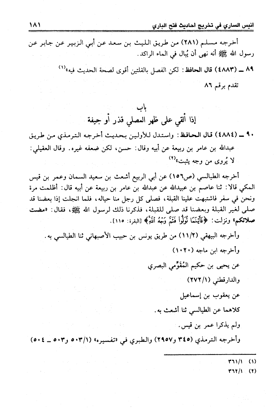 89 - (4883) قال الحافظ: لكن الفصل بالقلتين أقوى لصحة الحديث فيه" (¬1)