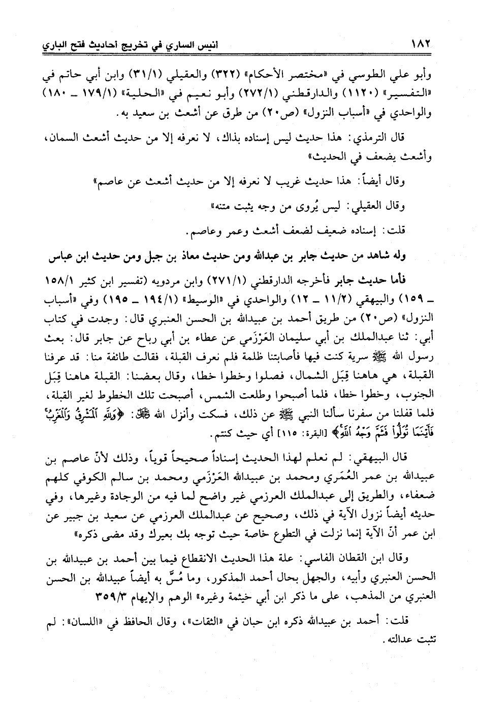 قال البيهقي: لم نعلم لهذا الحديث إسناداً صحيحاً قوياً، وذلك لأنّ عاصم بن عبيد الله بن عمر العُمَري ومحمد بن عبيد الله العَرْزَمي ومحمد بن سالم الكوفي كلهم ضعفاء، والطريق إلى عبد الملك العرزمي غير واضح لما فيه من الوجادة وغيرها، وفي حديثه أيضاً نزول الآية في ذلك، وصحيح عن عبد الملك العرزمي عن سعيد بن جبير عن ابن عمر أنّ الآية إنما نزلت في التطوع خاصة حيث توجه بك بعيرك وقد مضى ذكره".