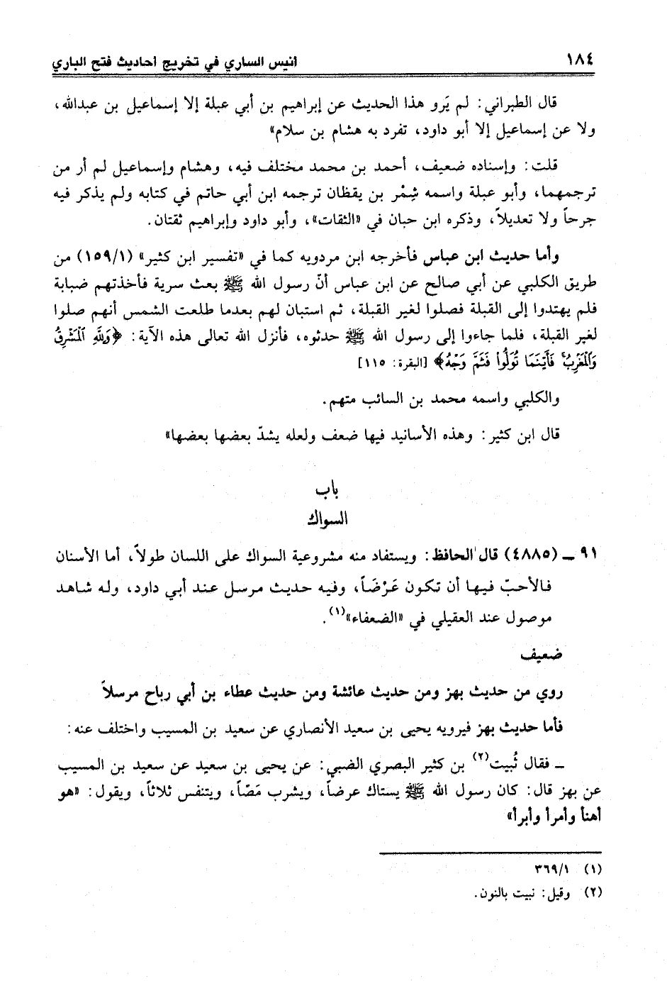 91 - (4885) قال الحافظ: ويستفاد منه مشروعية السواك على اللسان طولاً، أما الأسنان فالأحبّ فيها أن تكون عَرْضَاً، وفيه حديث مرسل عند أبي داود، وله شاهد موصول عند العقيلي في "الضعفاء" (¬1).