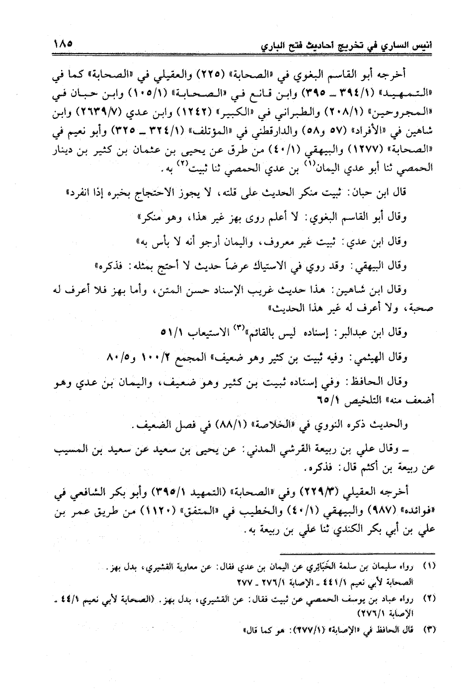 أخرجه أبو القاسم البغوي في "الصحابة" (225) والعقيلي في "الصحابة" كما في "التمهيد" (1/ 394 - 395) وابن قانع في "الصحابة" (1/ 105) وابن حبان في "المجروحين" (1277) والطبراني في "الكبير" (1242) وابن عدي (7/ 2639) وابن شاهين في "الأفراد" (57 و58) والدارقطني في "المؤتلف" (1/ 324 - 325) وأبو نعيم في "الصحابة" (1277) والبيهقي (1/ 40) من طرق عن يحيى بن عثمان بن كثير بن دينار الحمصي ثنا أبو عدي اليمان (¬1) بن عدي الحمصي ثنا ثبيت (¬2) به.