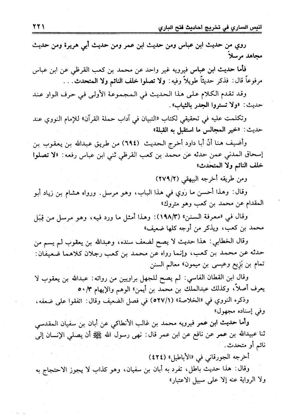 وأضيف هنا أنّ أبا داود أخرج الحديث (694) من طريق عبد الله بن يعقوب بن إسحاق المدني عمن حدثه عن محمد بن كعب القرظي ثني ابن عباس رفعه: "لا تصلوا خلف النائم ولا المتحدث"