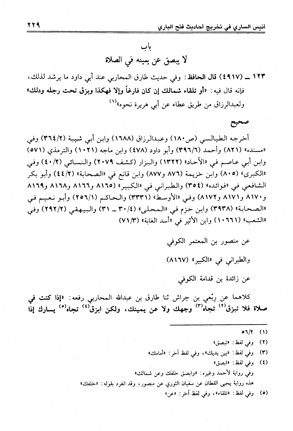 123 - (4917) قال الحافظ: وفي حديث طارق المحاربي عند أبي داود ما يرشد لذلك، فإنه قال فيه: "أو تلقاء شمالك إن كان فارغاً وإلا فهكذا وبزق تحت رجله ودلك" ولعبد الرزاق من طريق عطاء عن أبي هريرة نحوه" (¬1)