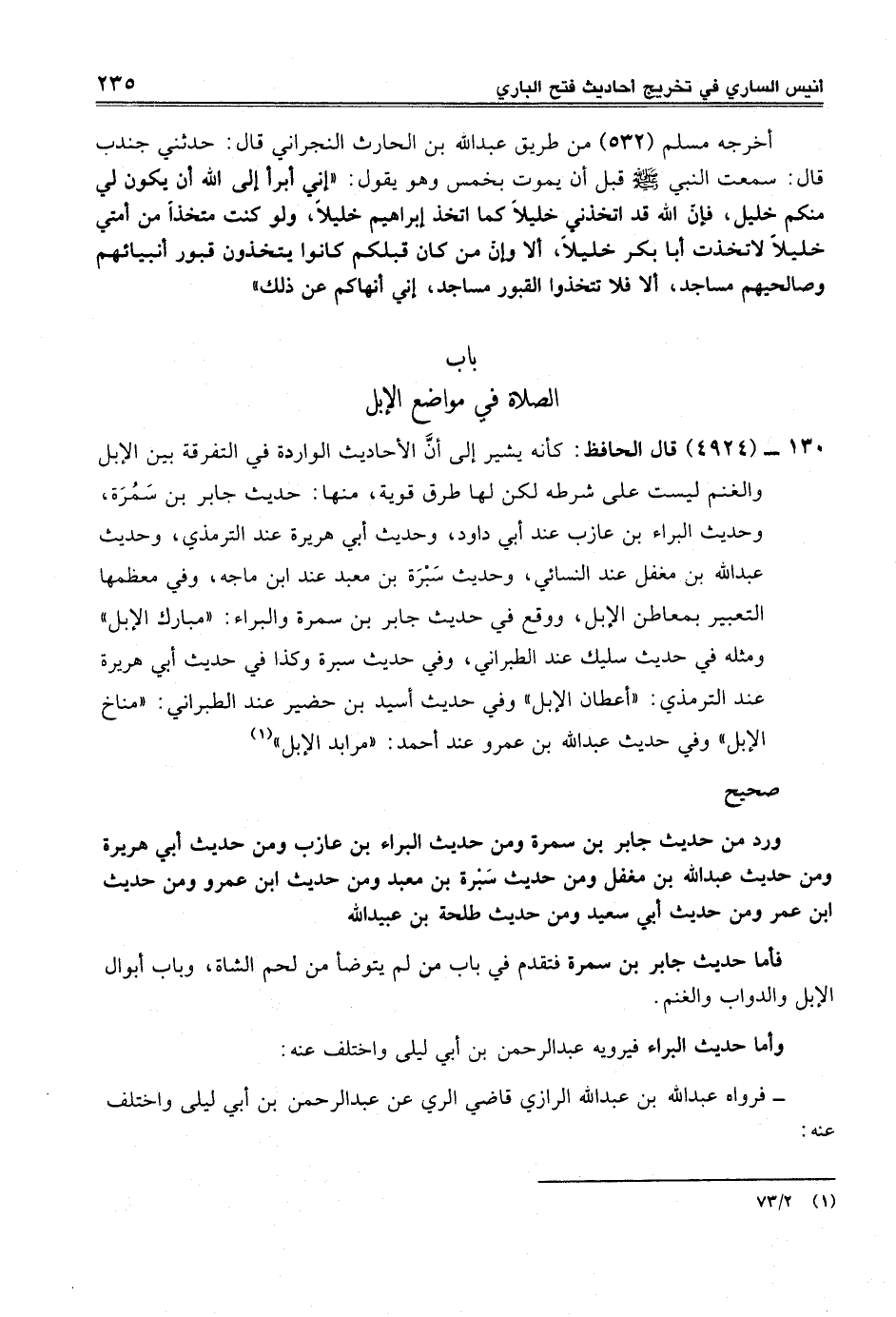 130 - (4924) قال الحافظ: كأنه يشير إلى أنَّ الأحاديث الواردة في التفرقة بين الإبل والغنم ليست على شرطه لكن لها طرق قوية، منها: حديث جابر بن سَمُرَة، وحديث البراء بن عازب عند أبي داود، وحديث أبي هريرة عند الترمذي، وحديث عبد الله بن مغفل عند النسائي، وحديث سَبْرَة بن معبد عند ابن ماجه، وفي معظمها التعبير بمعاطن الإبل، ووقع في حديث جابر بن سمرة والبراء: "مبارك الإبل" ومثله في حديث سليك عند الطبراني، وفي حديث سبرة وكذا في حديث أبي هريرة عند الترمذي: "أعطان الإبل" وفي حديث أسيد بن حضير عند الطبراني: "مناخ الإبل" وفي حديث عبد الله بن عمرو عند أحمد: "مرابد الإبل" (¬1)