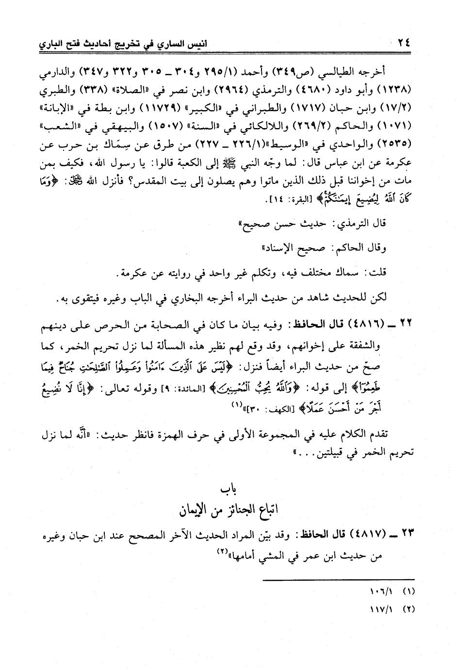 23 - (4817) قال الحافظ: وقد بين المراد الحديث الآخر المصحح عند ابن حبات وغيره من حديث ابن عمر في المشي أمامها" (¬2)