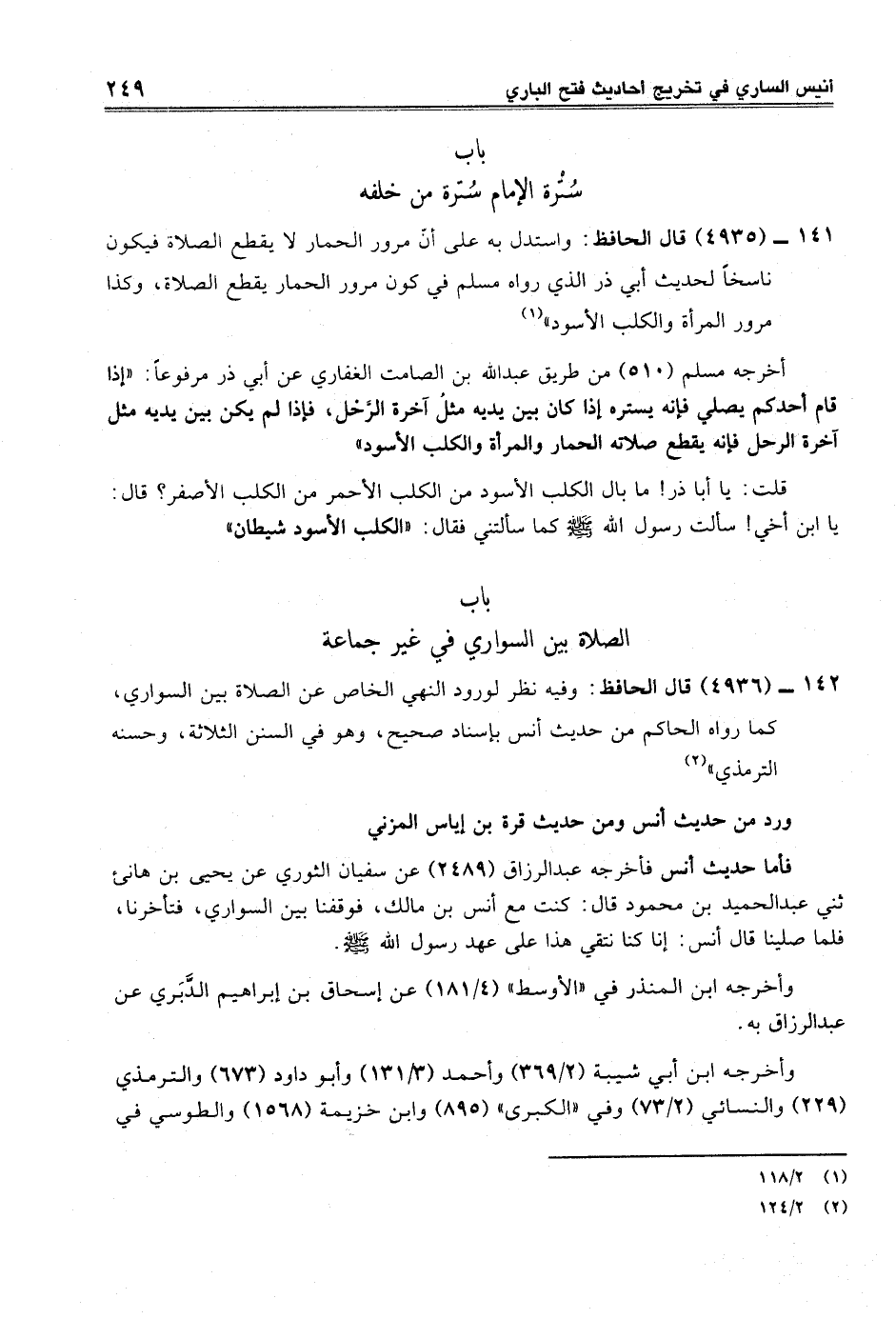141 - (4935) قال الحافظ: واستدل به على أنّ مرور الحمار لا يقطع الصلاة فيكون ناسخاً لحديث أبي ذر الذي رواه مسلم في كون مرور الحمار يقطع الصلاة، وكذا مرور المرأة والكلب الأسود" (¬1)
