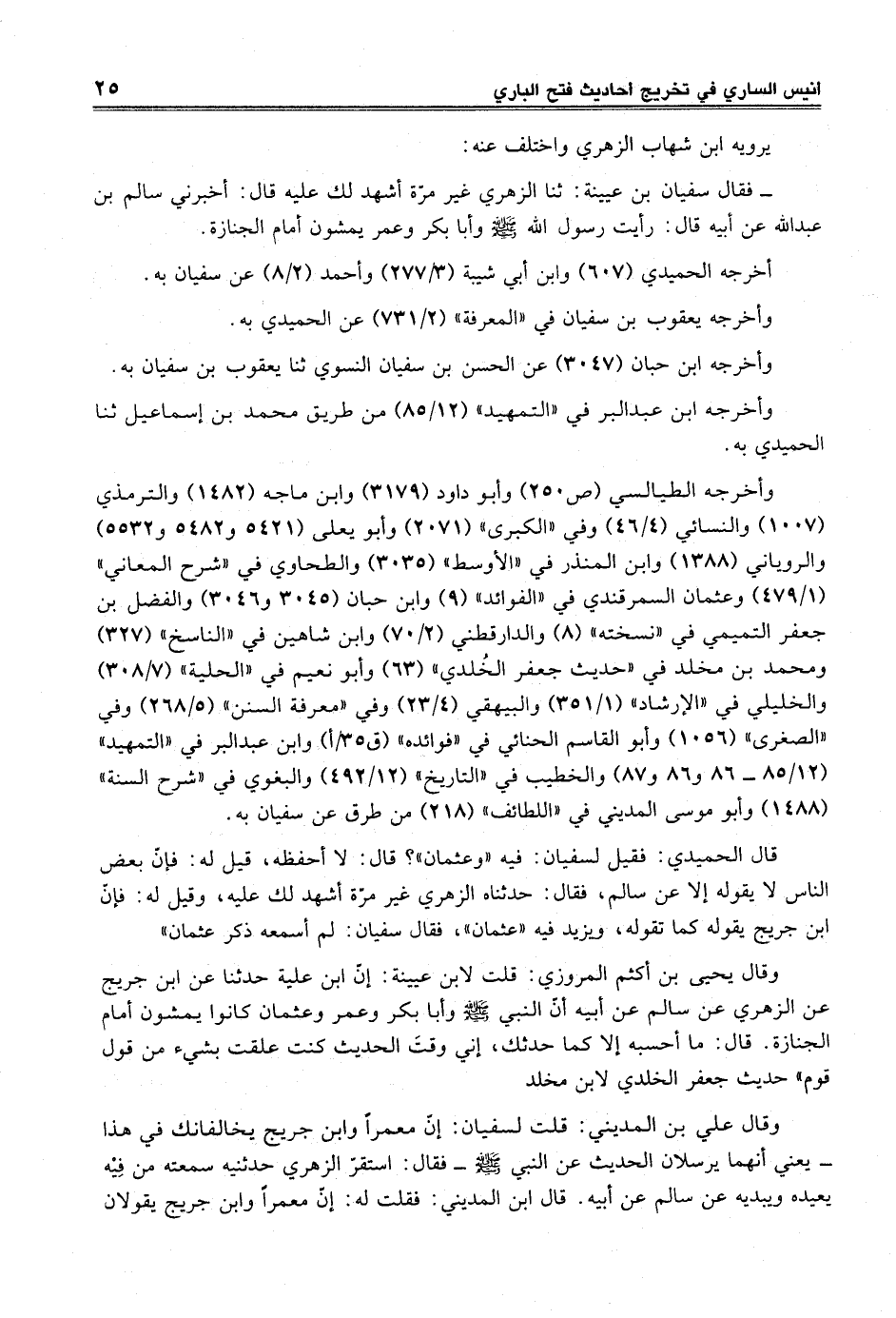 قال الحميدي: فقيل لسفيان: فيه "وعثمان"؟ قال: لا أحفظه، قيل له: فإنّ بعض الناس لا يقوله إلا عن سالم، فقال: حدثناه الزهري غير مرّة أشهد لك عليه، وقيل له: فإنّ ابن جريج يقوله كما تقوله، ويزيد فيه "عثمان"، فقال سفيان: لم أسمعه ذكر عثمان".