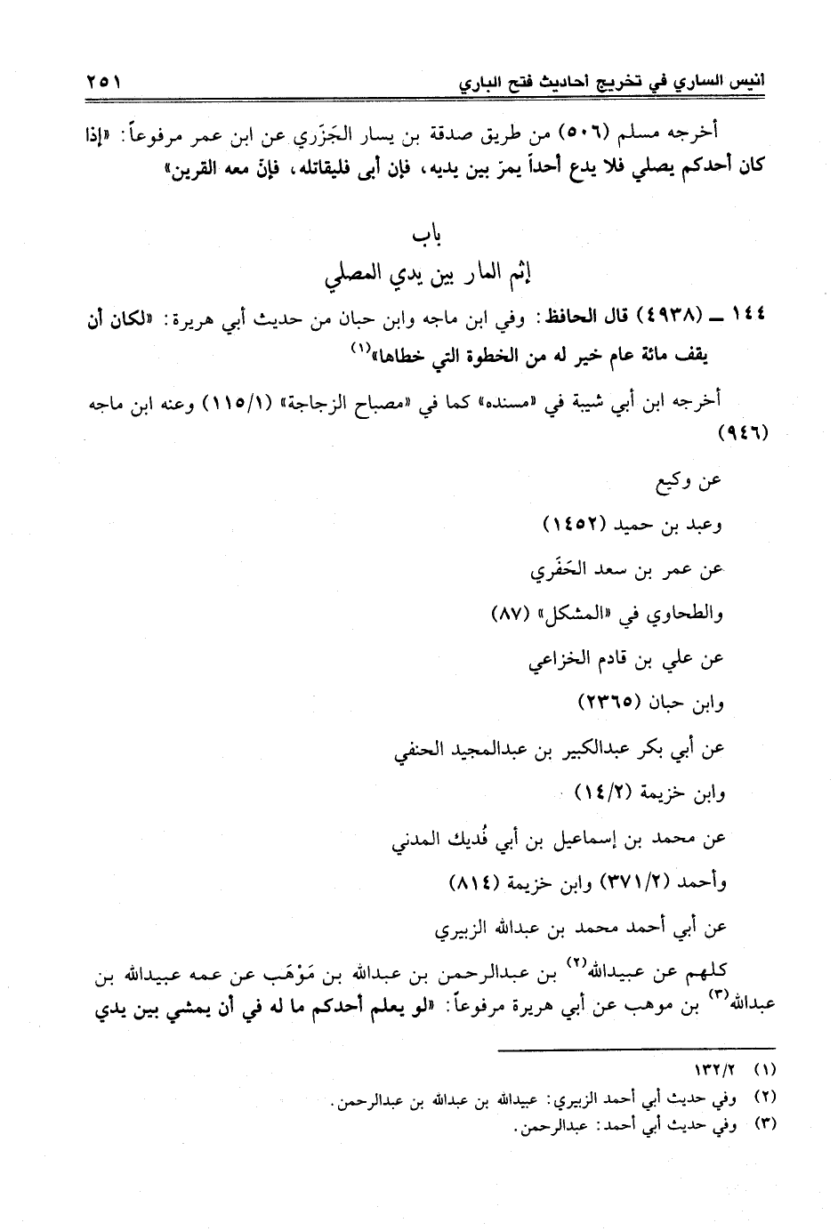 144 - (4938) قال الحافظ: وفي ابن ماجه وابن حبان من حديث أبي هريرة: "لكان أن يقف مائة عام خير له من الخطوة التي خطاها" (¬1)