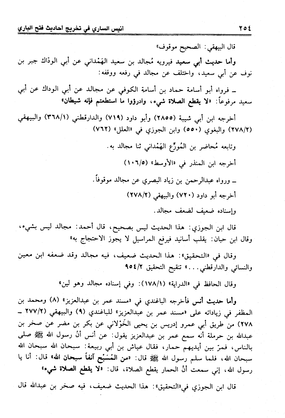 - فرواه أبو أسامة حماد بن أسامة الكوفي عن مجالد عن أبي الوداك عن أبي سعيد مرفوعاً: "لا يقطع الصلاة شيء، وادرؤوا ما استطعتم فإنه شيطان"