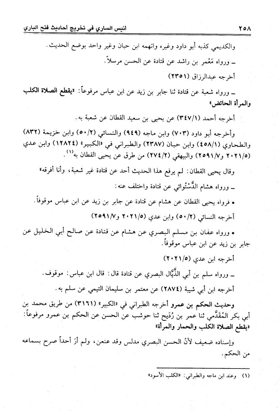 - ورواه شعبة عن قتادة ثنا جابر بن زيد عن ابن عباس مرفوعاً: "يقطع الصلاة الكلب والمرأة الحائض"