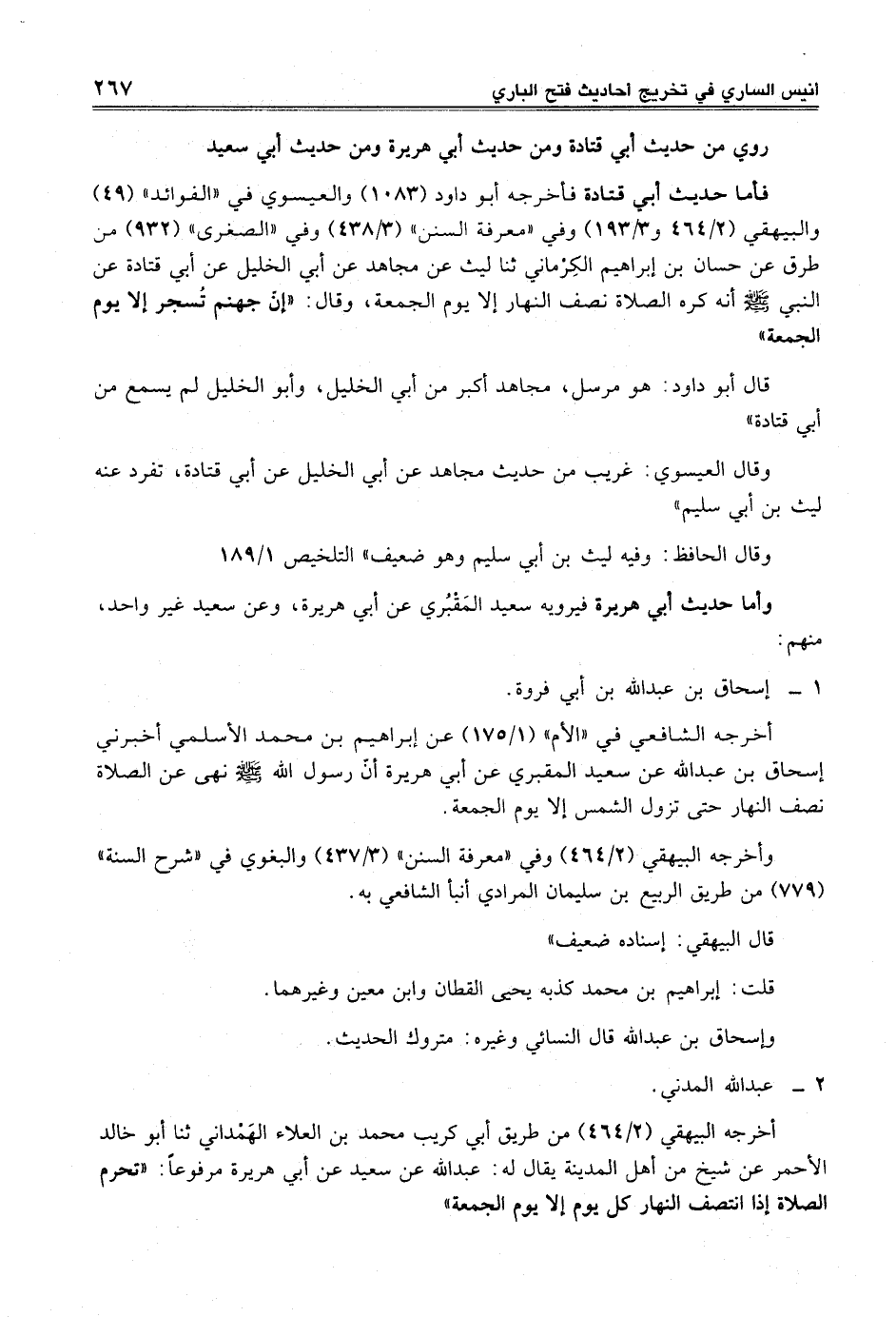 فأما حديث أبي قتادة فأخرجه أبو داود (1083) والعيسوي في "الفوائد" (49) والبيهقي (4/ 462 و3/ 193) وفي "معرفة السنن" (3/ 438) وفي "الصغرى" (932) من طرق عن حسان بن إبراهيم الكِرْماني ثنا ليث عن مجاهد عن أبي الخليل عن أبي قتادة عن النبي -صلى الله عليه وسلم- أنه كره الصلاة نصف النهار إلا يوم الجمعة، وقال: "إنّ جهنم تُسجر إلا يوم الجمعة"