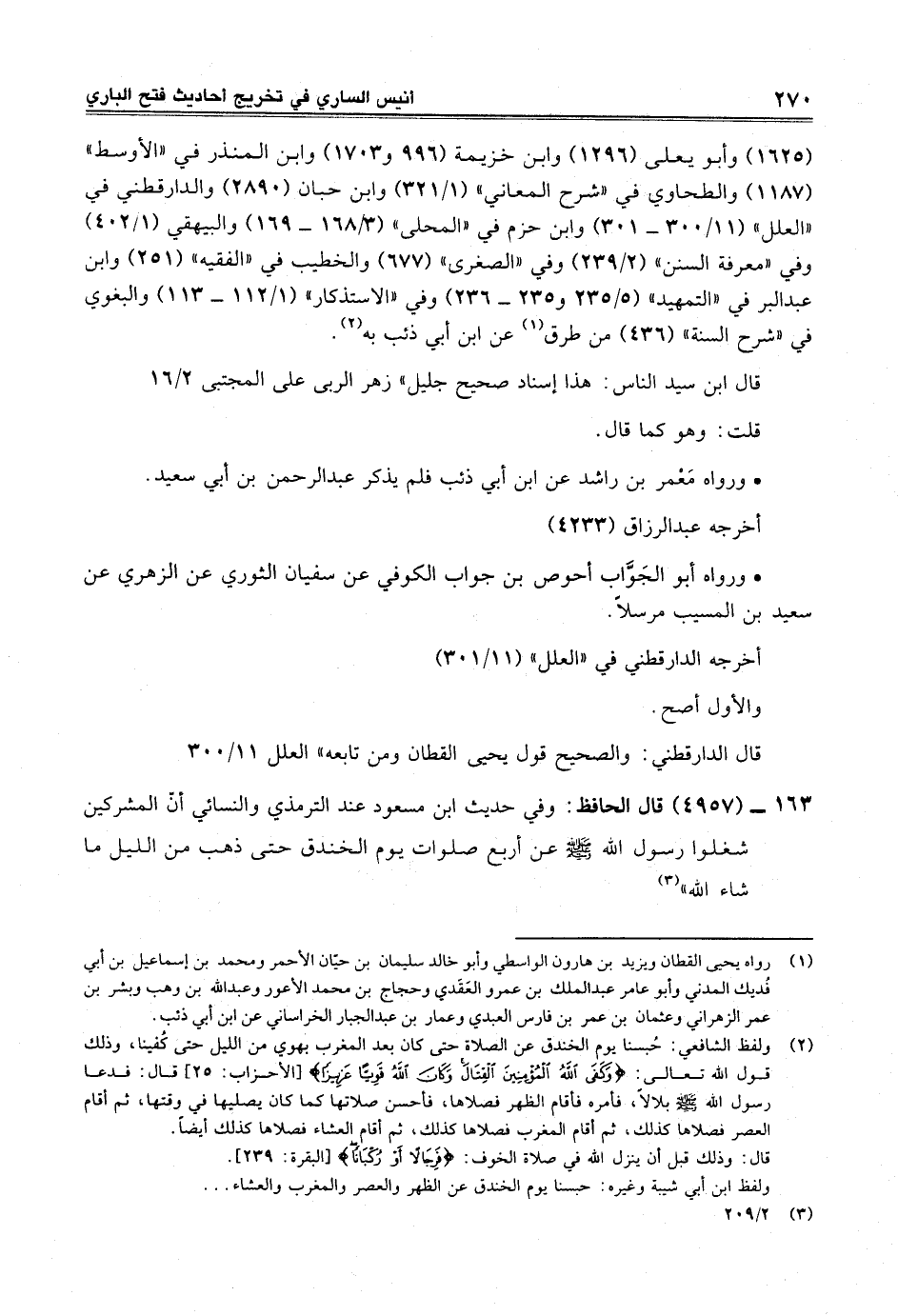 163 - (4957) قال الحافظ: وفي حديث ابن مسعود عند الترمذي والنسائي أنّ المشركين شغلوا رسول الله -صلى الله عليه وسلم- عن أربع صلوات يوم الخندق حتى ذهب من الليل ما شاء الله" (¬3)
