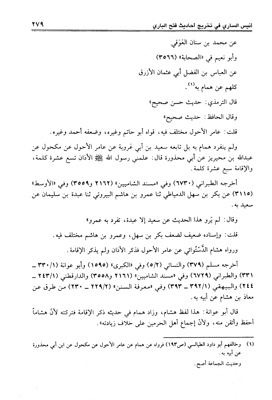 ولم ينفرد همام به بل تابعه سعيد بن أبي عَروبة عن عامر الأحول عن مكحول عن عبد الله بن محيريز عن أبي محذورة قال: علمني رسول الله -صلى الله عليه وسلم- الأذان تسع عشرة كلمة، والإقامة سبع عشرة كلمة.