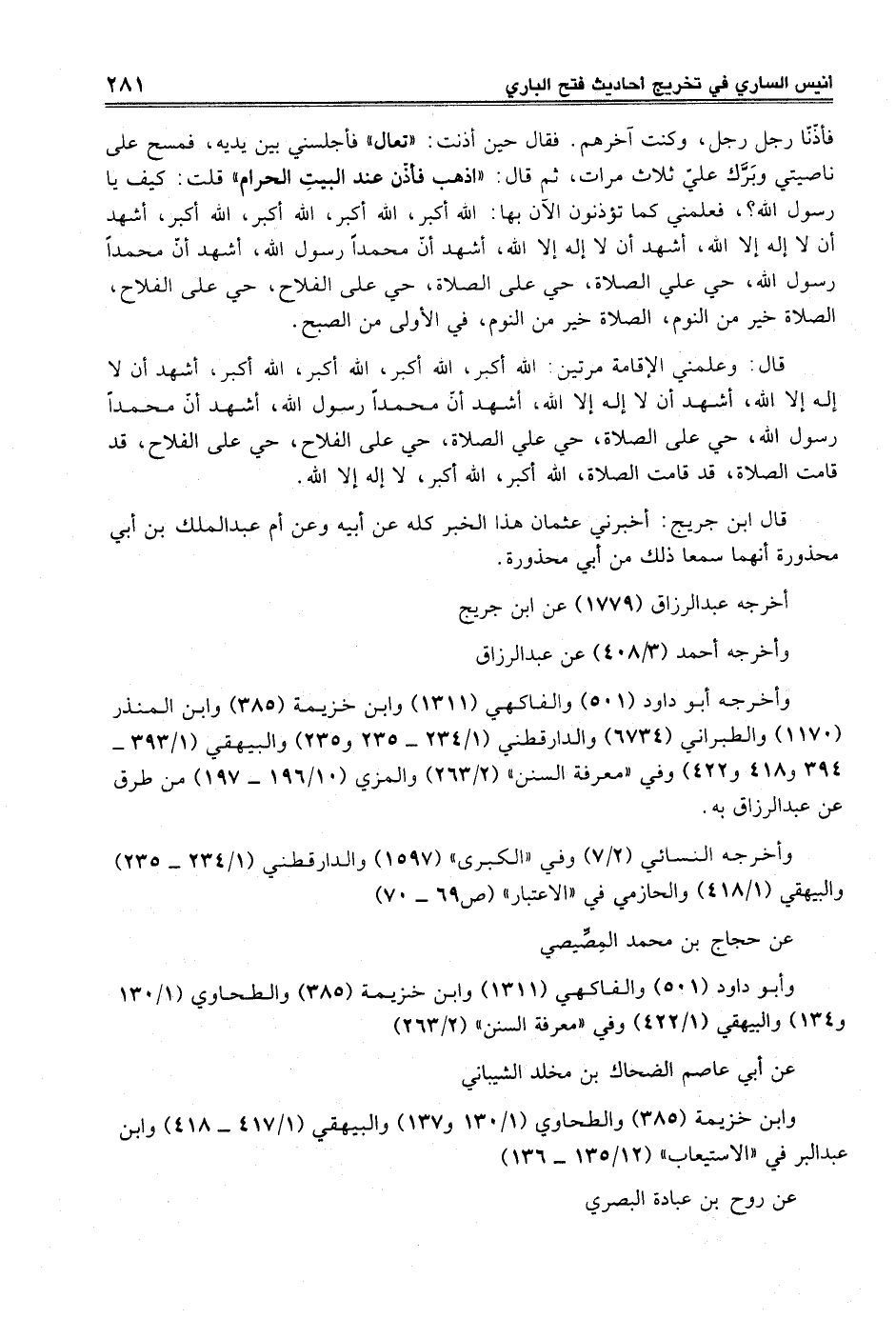 فأذّنّا رجل رجل، وكنت آخرهم. فقال حين أذنت: "تعال" فأجلسني بين يديه، فمسح على ناصيتي وبَرَّك عليّ ثلاث مرات، ثم قال: "اذهب فأذّن عند البيتِ الحرام" قلت: كيف يا رسول الله؟، فعلمني كما تؤذنون الآن بها: الله أكبر، الله أكبر، الله أكبر، الله أكبر، أشهد أن لا إله إلا الله، أشهد أن لا إله إلا الله، أشهد أنّ محمداً رسول الله، أشهد أنّ محمداً رسول الله، حي علي الصلاة، حي على الصلاة، حي على الفلاح، حي على الفلاح، الصلاة خير من النوم، الصلاة خير من النوم، في الأولى من الصبح.