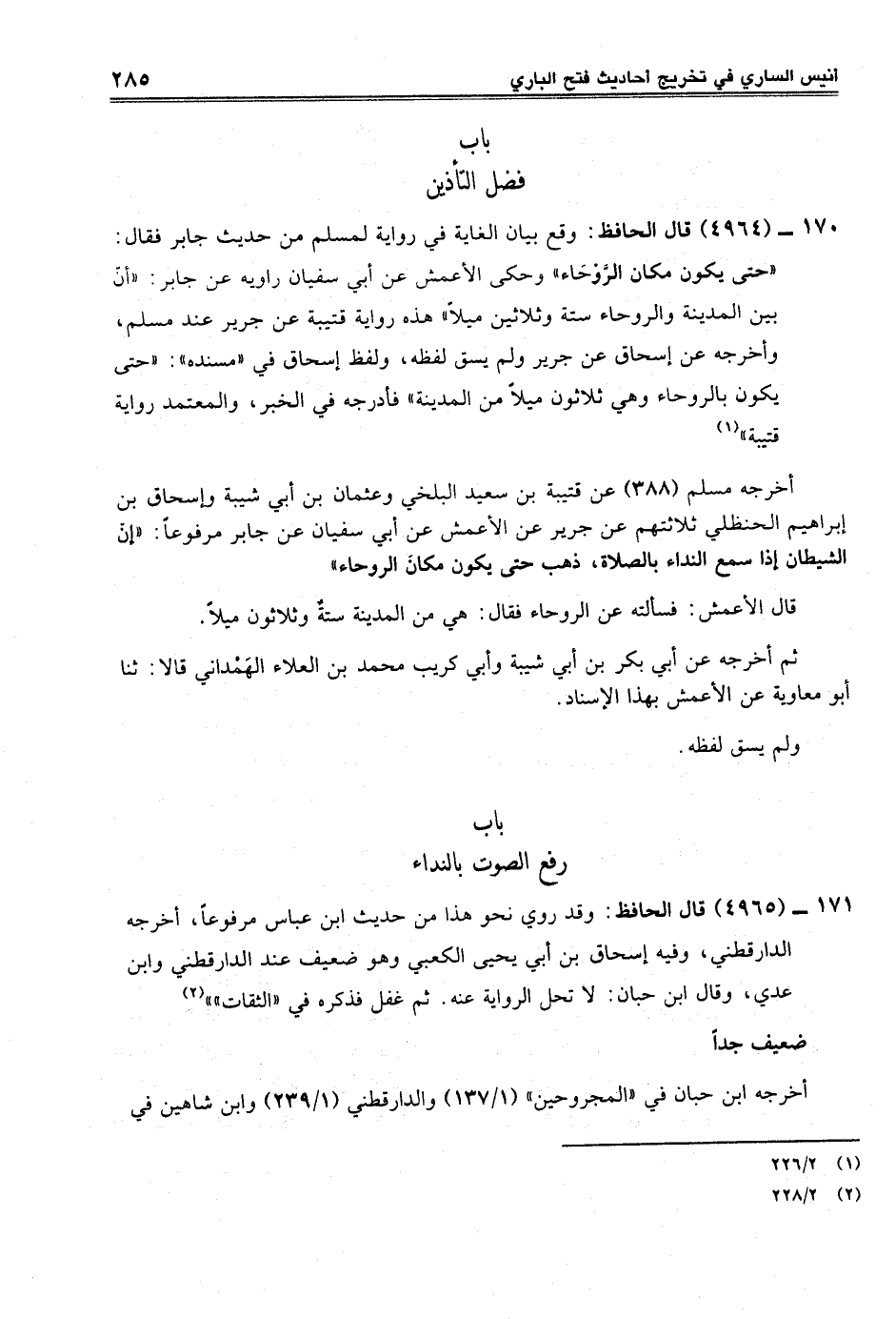 170 - (4964) قال الحافظ: وقع بيان الغاية في رواية لمسلم من حديث جابر فقال: "حتى يكون مكان الرَّوْحَاء" وحكى الأعمش عن أبي سفيان راويه عن جابر: "أنّ بين المدينة والروحاء ستة وثلاثين ميلاً" هذه رواية قتيبة عن جرير عند مسلم، وأخرجه عن إسحاق عن جرير ولم يسق لفظه، ولفظ إسحاق في "مسنده": "حتى يكون بالروحاء وهي ثلاثون ميلاً من المدينة" فأدرجه في الخبر، والمعتمد رواية قتيبة" (¬1)
