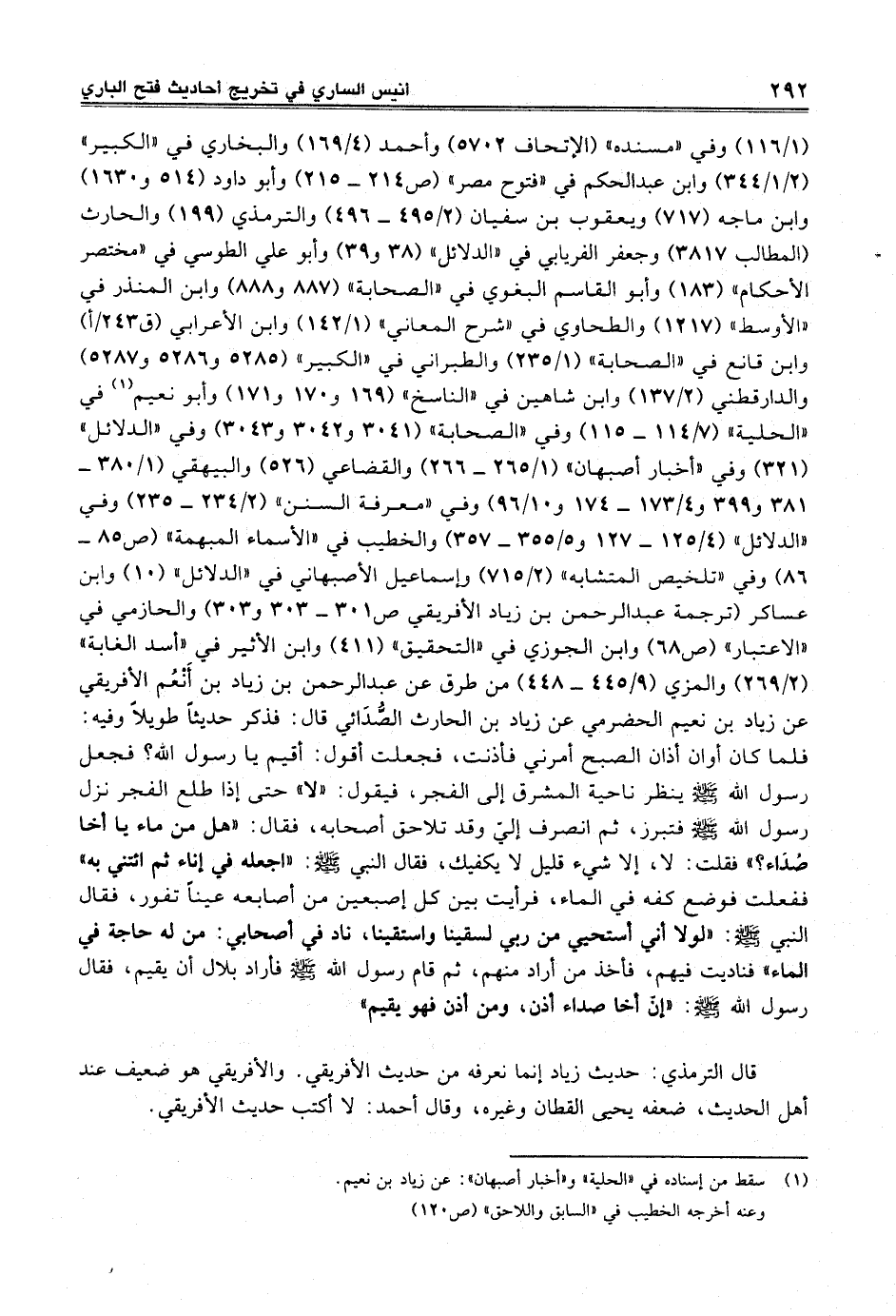 (1/ 116) وفي "مسنده" (الإتحاف 5702) وأحمد (4/ 169) والبخاري في "الكبير" (2/ 1/ 344) وابن عبد الحكم في "فتوح مصر" (ص 214 - 215) وأبو داود (514 و1630) وابن ماجه (717) ويعقوب بن سفيان (2/ 495 - 496) والترمذي (199) والحارث (الطالب 3817) وجعفر الفريابي في "الدلائل" (38 و39) وأبو علي الطوسي في "مختصر الأحكام" (183) وأبو القاسم البغوي في "الصحابة" (887 و888) وابن المنذر في "الأوسط" (1217) والطحاوي في "شرح المعاني" (1/ 142) وابن الأعرابي (ق 243/ أ) وابن قانع في "الصحابة" (1/ 235) والطبراني في "الكبير" (5285 و5286 و5287) والدارقطني (2/ 137) وابن شاهين في "الناسخ" (169 و170 و171) وأبو نعيم (¬1) في "الحلية" (7/ 114 - 115) وفي "الصحابة" (3041 و3042 و3043) وفي "الدلائل" (321) وفي "أخبار أصبهان" (1/ 265 - 266) والقضاعي (526) والبيهقي (1/ 380 - 381 و399 و4/ 173 - 174 و10/ 96) وفي "معرفة السنن" (2/ 234 - 235) وفي "الدلائل" (4/ 125 - 127 و5/ 355 - 357) والخطيب في "الأسماء المبهمة" (ص 85 - 86) وفي "تلخيص المتشابه" (2/ 715) واسماعيل الأصبهاني في "الدلائل" (10) وابن عساكر (ترجمة عبد الرحمن بن زياد الأفريقي ص 301 - 303 و303) والحازمي في "الاعتبار" (ص 68) وابن الجوزي في "التحقيق" (411) وابن الأثير في "أسد الغابة" (2/ 269) والمزي (9/ 445 - 448) من طرق عن عبد الرحمن بن زياد بن أَنْعُم الأفريقي عن زياد بن نعيم الحضرمي عن زياد بن الحارث الصُّدَائي قال: فذكر حديثاً طويلاً وفيه: فلما كان أوان أذان الصبح أمرني فأذنت، فجعلت أقول: أقيم يا رسول الله؟ فجعل رسول الله -صلى الله عليه وسلم- ينظر ناحية المشرق إلى الفجر، فيقول: "لا" حتى إذا طلع الفجر نزل رسول الله -صلى الله عليه وسلم- فتبرز، ثم انصرف إليّ وقد تلاحق أصحابه، فقال: "هل من ماء يا أخا صُدَاء؟ " فقلت: لا، إلا شيء قليل لا يكفيك، فقال النبي -صلى الله عليه وسلم-: "اجعله في إناء ثم ائتني به" ففعلت فوضع كفه في الماء، فرأيت بين كل إصبعين من أصابعه عيناً تفور، فقال النبي -صلى الله عليه وسلم-: "لولا أني أستحيي من ربي لسقينا واستقينا، ناد في أصحابي: من له حاجة في الماء" فناديت فيهم، فأخذ من أراد منهم، ثم قام رسول الله -صلى الله عليه وسلم- فأراد بلال أن يقيم، فقال رسول الله -صلى الله عليه وسلم-: "إنّ أخا صداء أذن، ومن أذن فهو يقيم"