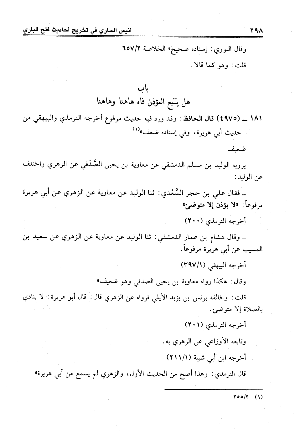 181 - (4975) قال الحافظ: وقد ورد فيه حديث مرفوع أخرجه الترمذي والبيهقي من حديث أبي هريرة، وفي إسناده ضعف" (¬1)