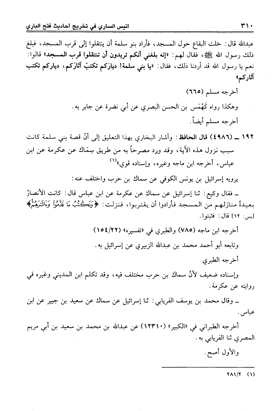192 - (4986) قال الحافظ: وأشار البخاري بهذا التعليق إلى أنّ قصة بنى سلمة كانت سبب نزول هذه الآية، وقد ورد مصرحاً به من طريق سِمَاك عن عكرمة عن ابن عباس، أخرجه ابن ماجه وغيره، وإسناده قوي" (¬1)