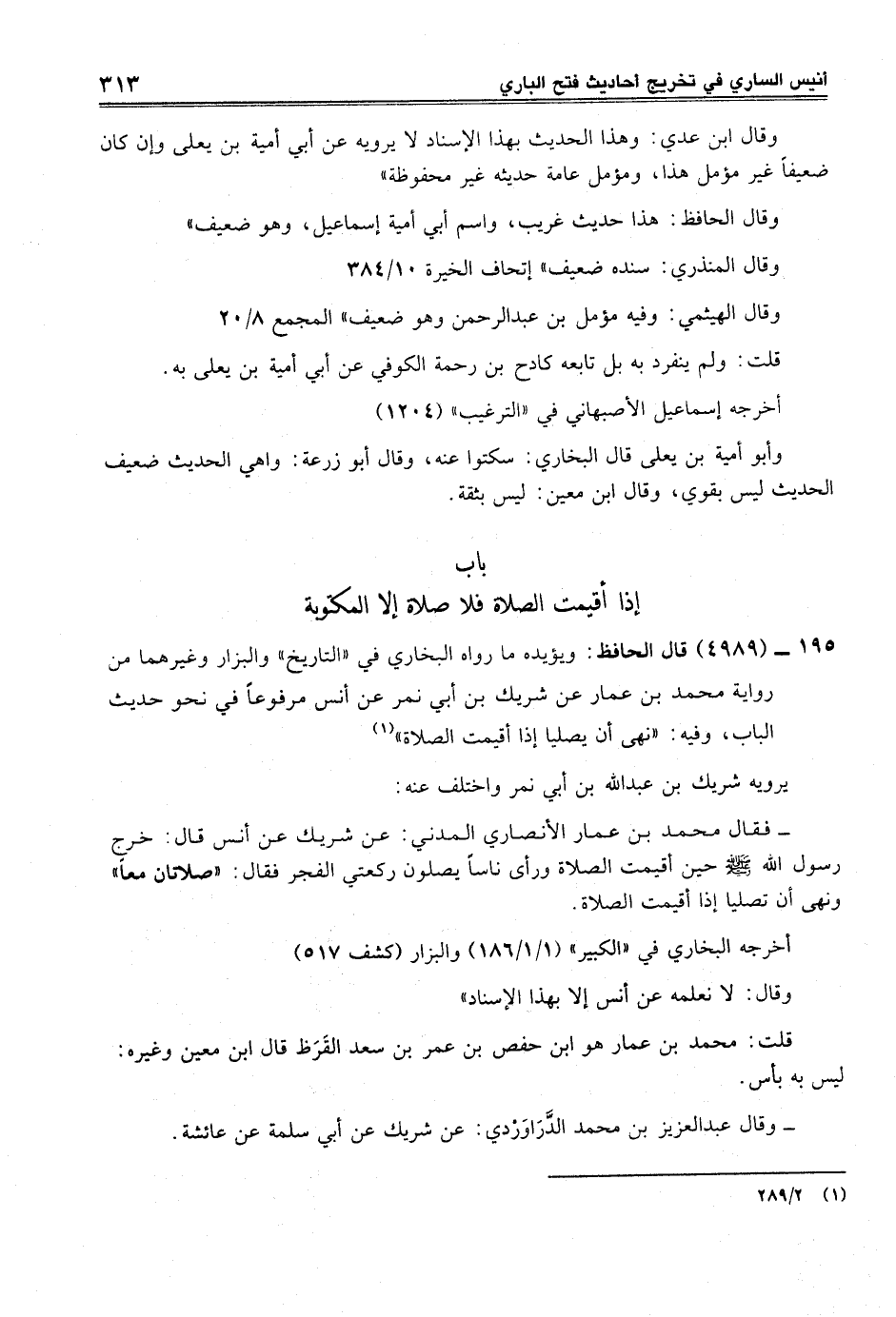195 - (4989) قال الحافظ: ويؤيده ما رواه البخاري في "التاريخ" والبزار وغيرهما من رواية محمد بن عمار عن شريك بن أبي نمر عن أنس مرفوعاً في نحو حديث الباب، وفيه: "نهى أن يصليا إذا أقيمت الصلاة" (¬1)