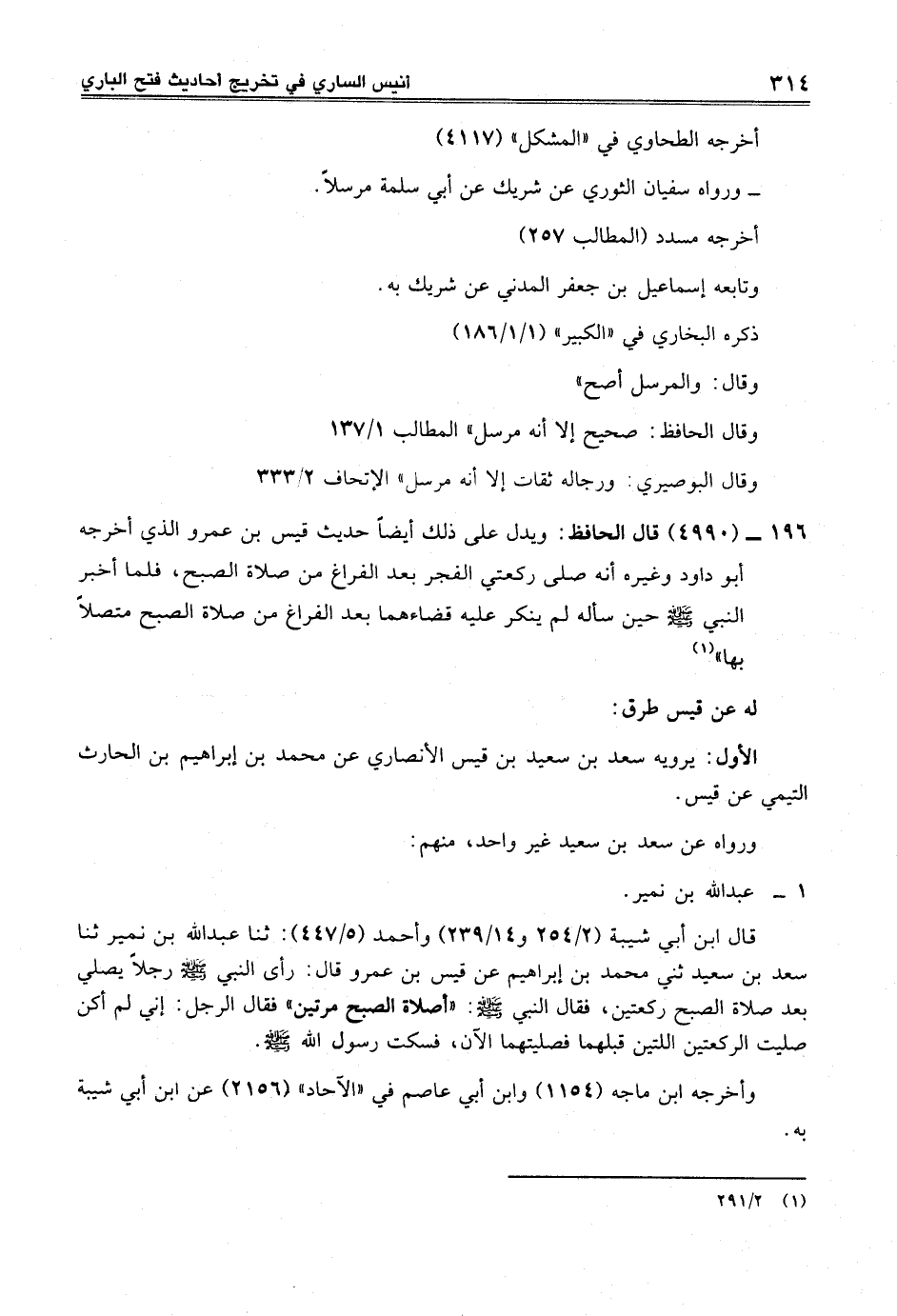 قال ابن أبي شيبة (2/ 254 و14/ 239) وأحمد (5/ 447): ثنا عبد الله بن نمير ثنا سعد بن سعيد ثني محمد بن إبراهيم عن قيس بن عمرو قال: رأى النبي -صلى الله عليه وسلم- رجلاً يصلي بعد صلاة الصبح ركعتين، فقال النبي -صلى الله عليه وسلم-: "أصلاة الصبح مرتين" فقال الرجل: إني لم أكن صليت الركعتين اللتين قبلهما فصليتهما الآن، فسكت رسول الله -صلى الله عليه وسلم-.
