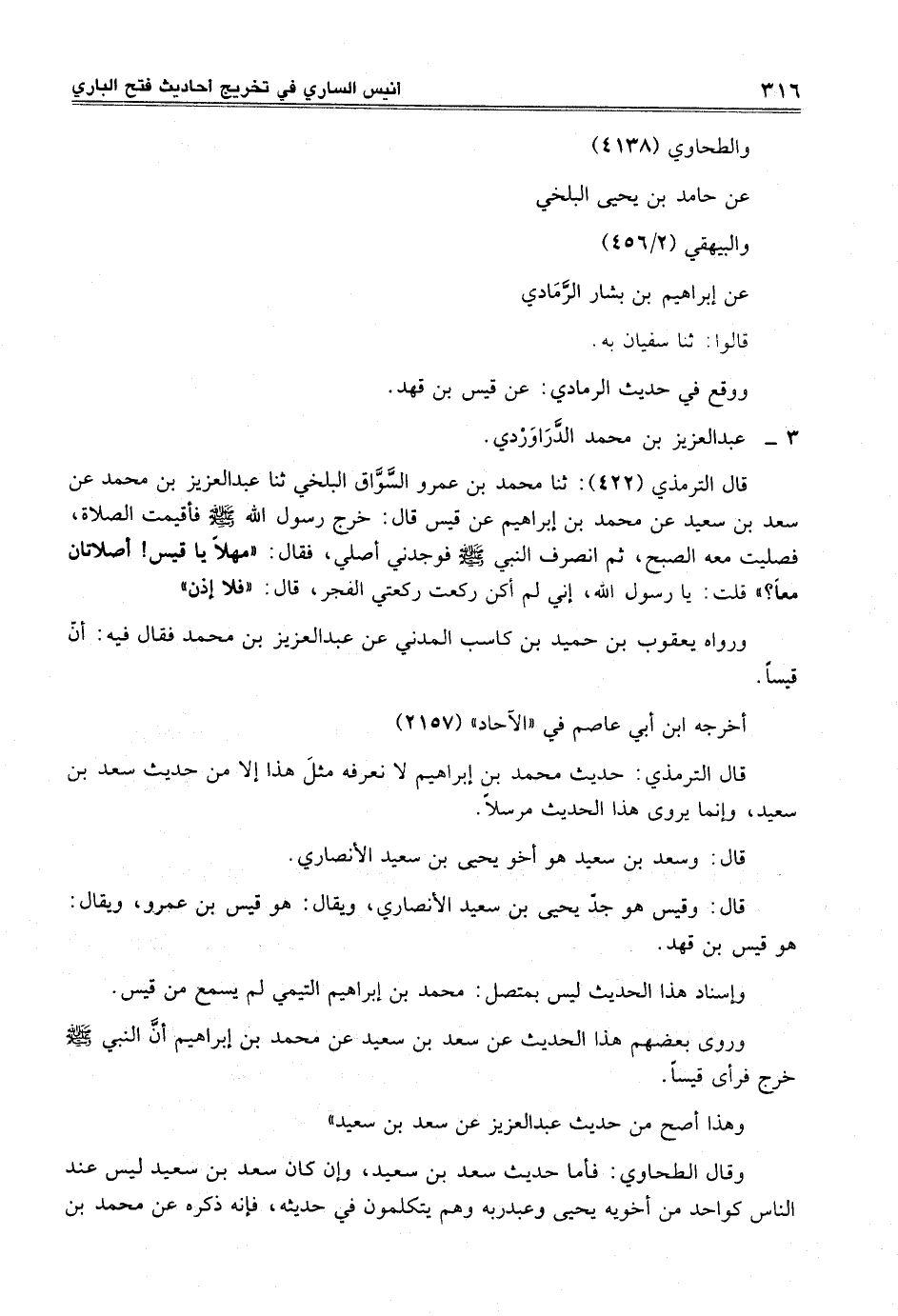 قال الترمذي (422): ثنا محمد بن عمرو السَّوَّاق البلخي ثنا عبد العزيز بن محمد عن سعد بن سعيد عن محمد بن إبراهيم عن قيس قال: خرج رسول الله -صلى الله عليه وسلم- فأقيمت الصلاة، فصليت معه الصبح، ثم انصرف النبي -صلى الله عليه وسلم- فوجدني أصلي، فقال: "مهلاً يا قيس! أصلاتان معاً؟ " قلت: يا رسول الله، إني لم أكن ركعت ركعتي الفجر، قال: "فلا إذن"