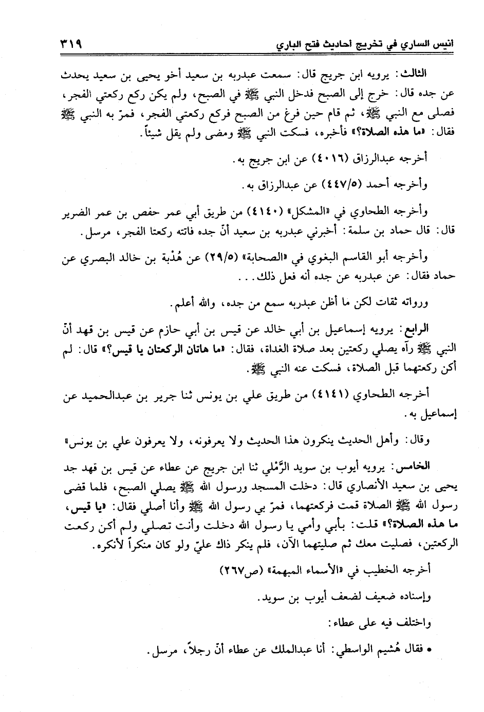 الرابع: يرويه إسماعيل بن أبي خالد عن قيس بن أبي حازم عن قيس بن قهد أنّ النبي -صلى الله عليه وسلم- رآه يصلي ركعتين بعد صلاة الغداة، فقال: "ما هاتان الركعتان يا قيس؟ " قال: لم أكن ركعتهما قبل الصلاة، فسكت عنه النبي -صلى الله عليه وسلم-.