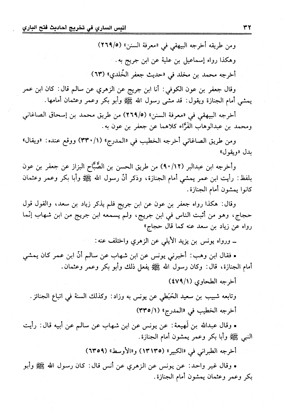 وقال جعفر بن عون الكوفي: أنا ابن جريج عن الزهري عن سالم قال: كان ابن عمر يمشي أمام الجنازة ويقول: قد مشى رسول الله -صلى الله عليه وسلم- وأبو بكر وعمر وعثمان أمامها.