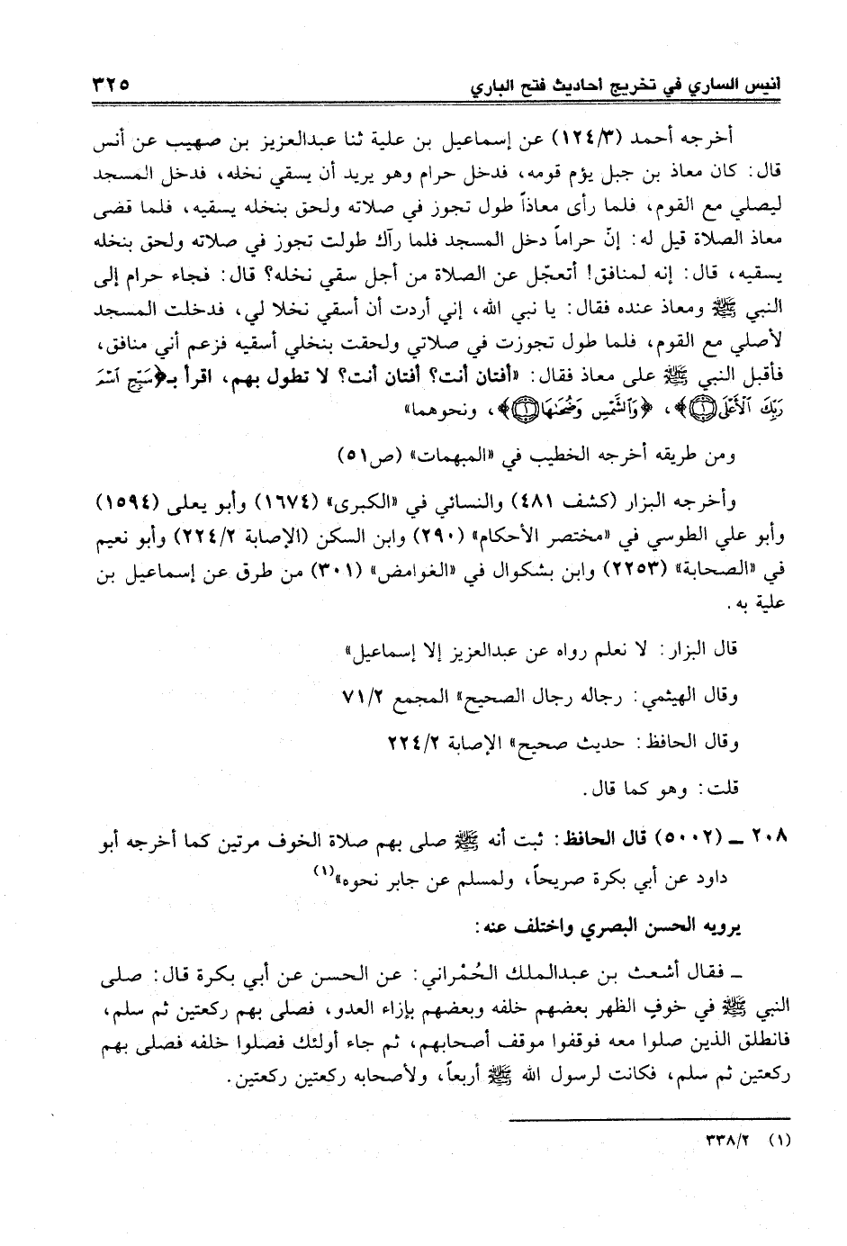 208 - (5002) قال الحافظ: ثبت أنه -صلى الله عليه وسلم- صلى بهم صلاة الخوف مرتين كما أخرجه أبو داود عن أبي بكرة صريحاً، ولمسلم عن جابر نحوه" (¬1)