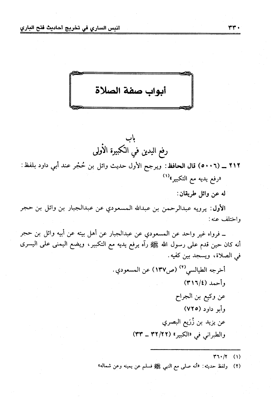 212 - (5006) قال الحافظ: ويرجح الأول حديث وائل بن حُجْر عند أبي داود بلفظ: "رفع يديه مع التكبير" (¬1)