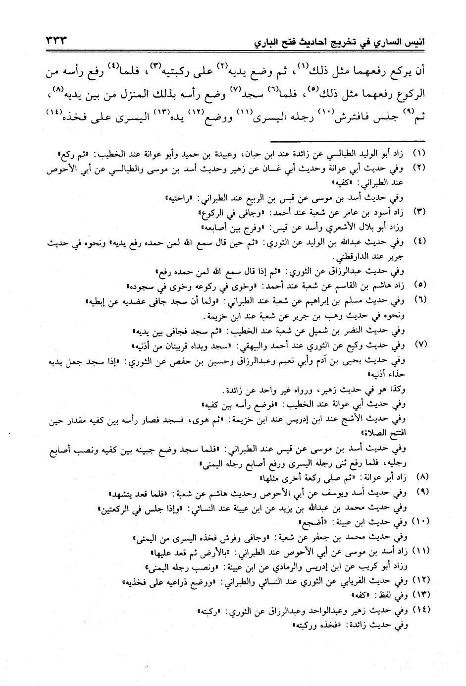 (¬12) وفي حديث الفريابي عن الثوري عند النساني والطبراني: "ووضع ذراعيه على فخذيه".