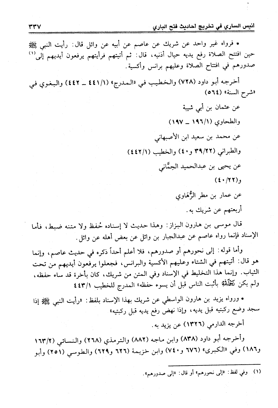 • فرواه غير واحد عن شريك عن عاصم عن أبيه عن وائل قال: رأيت النبي -صلى الله عليه وسلم- حين افتتح الصلاة رفع يديه حيال أذنيه، قال: ثم أتيتهم فرأيتهم يرفعون أيديهم إلى (¬1) صدورهم في افتتاح الصلاة وعليهم برانس وأكسية.