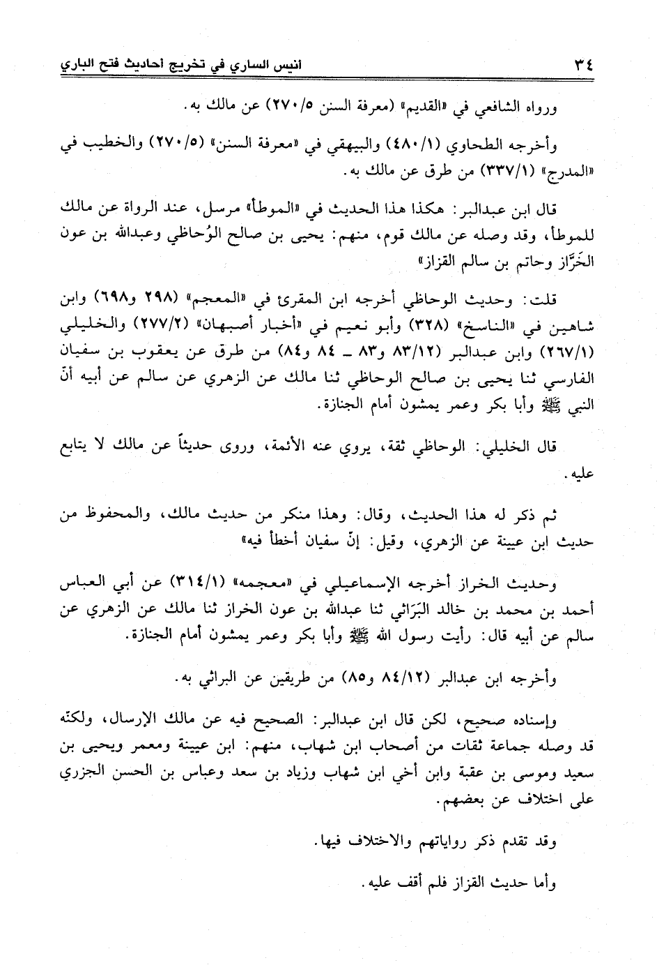 قلت: وحديث الوحاظي أخرجه ابن المقرىء في "المعجم" (298 و698) وابن شاهين في "الناسخ" (328) وأبو نعيم في "أخبار أصبهان" (2/ 277) والخليلي (1/ 267) وابن عبد البر (12/ 83 و83 - 84 و84) من طرق عن يعقوب بن سفيان الفارسي ثنا يحيى بن صالح الوحاظي ثنا مالك عن الزهري عن سالم عن أبيه أنّ النبي -صلى الله عليه وسلم- وأبا بكر وعمر يمشون أمام الجنازة.