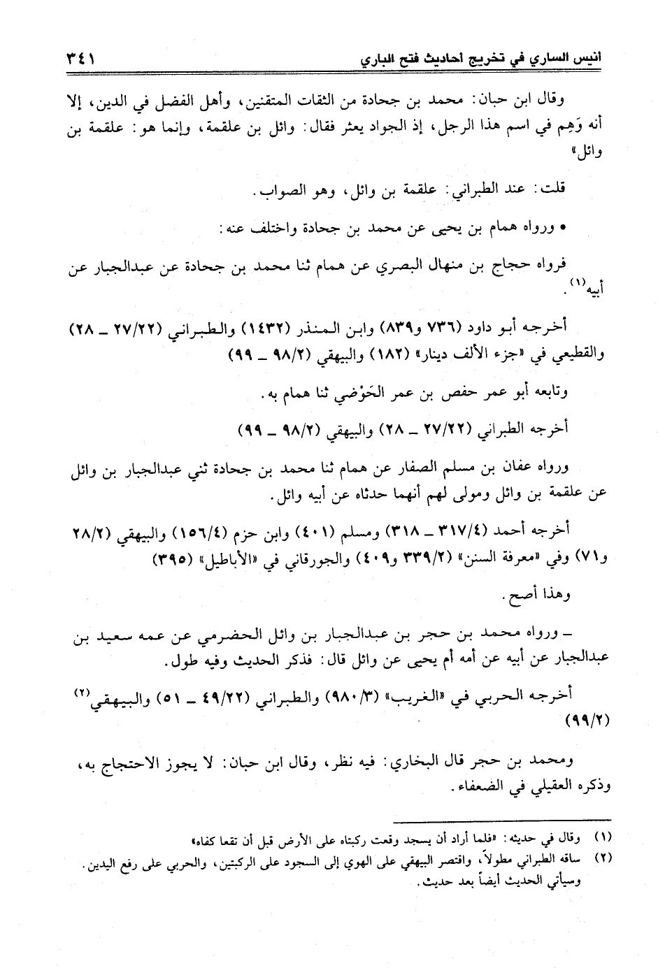 ورواه عفان بن مسلم الصفار عن همام ثنا محمد بن جحادة ثني عبد الجبار بن وائل عن علقمة بن وائل ومولى لهم أنهما حدثاه عن أبيه وائل.