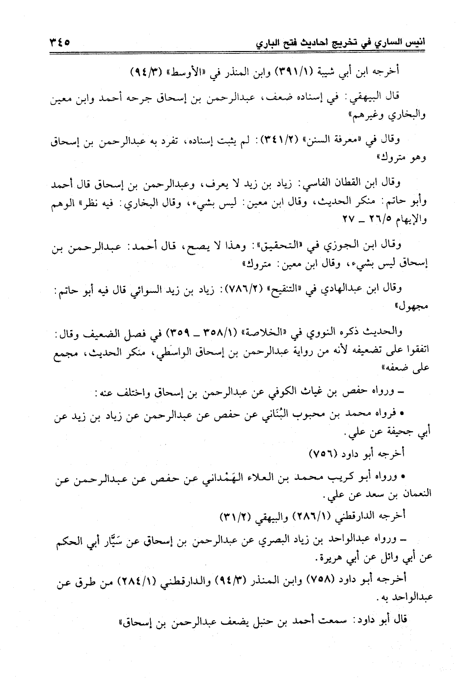 وقال ابن الجوزي في "التحقيق": وهذا لا يصح، قال أحمد: عبد الرحمن بن إسحاق ليس بشىء، وقال ابن معين: متروك"