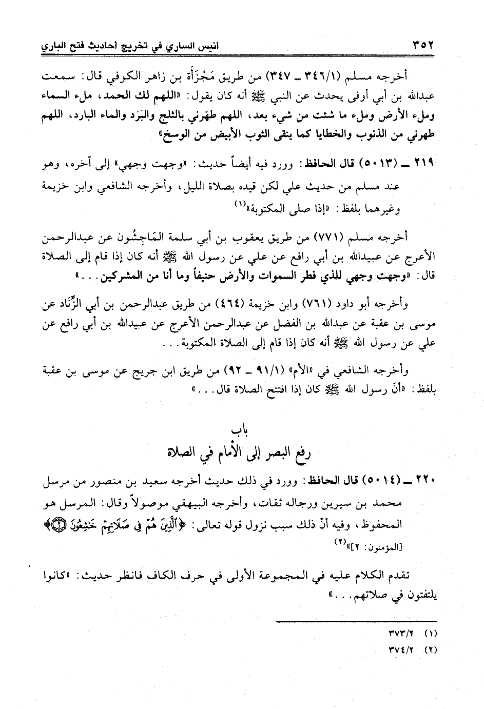 219 - (5013) قال الحافظ: وورد فيه أيضاً حديث: "وجهت وجهي" إلى آخره، وهو عند مسلم من حديث علي لكن قيده بصلاة الليل، وأخرجه الشافعي وابن خزيمة وغيرهما بلفظ: "إذا صلى المكتوبة" (¬1)