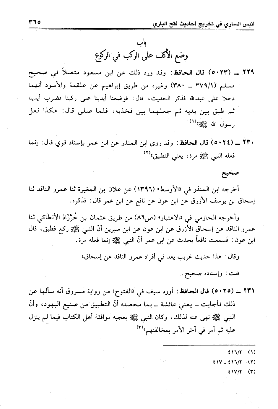 230 - (5024) قال الحافظ: وقد روى ابن المنذر عن ابن عمر بإسناد قوي قال: إنما فعله النبي -صلى الله عليه وسلم- مرة، يعني التطبيق" (¬2)