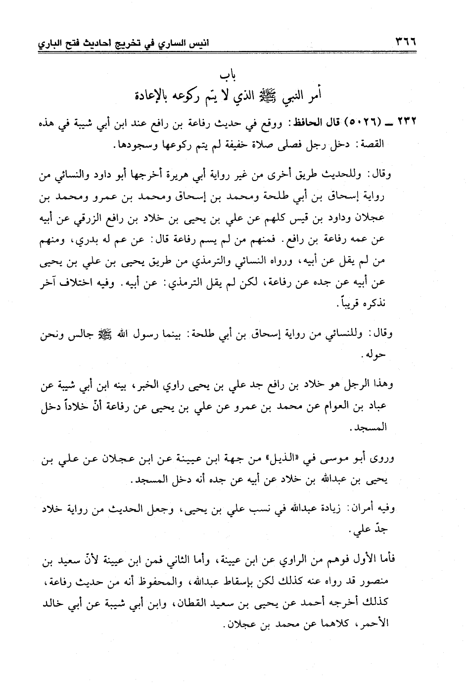 232 - (5026) قال الحافظ: ووقع في حديث رفاعة بن رافع عند ابن أبي شيبة في هذه القصة: دخل رجل فصلى صلاة خفيفة لم يتم ركوعها وسجودها.