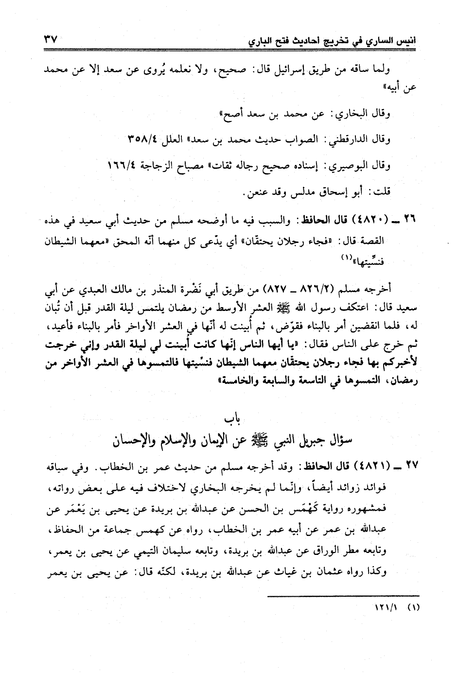 27 - (4821) قال الحافظ: وقد أخرجه مسلم من حديث عمر بن الخطاب. وفي سياقه فوائد زوائد أيضاً، وانّما لم يخرجه البخاري لاختلاف فيه على بعض رواته، فمشهوره رواية كَهْمَس بن الحسن عن عبد الله بن بريدة عن يحيى بن يَعْمَر عن عبد الله بن عمر عن أبيه عمر بن الخطاب، رواه عن كهمس جماعة من الحفاظ، وتابعه مطر الوراق عن عبد الله بن بريدة، وتابعه سليمان التيمي عن يحيى بن يعمر، وكذا رواه عثمان بن غياث عن عبد الله بن بريدة، لكنّه قال: عن يحيى بن يعمر