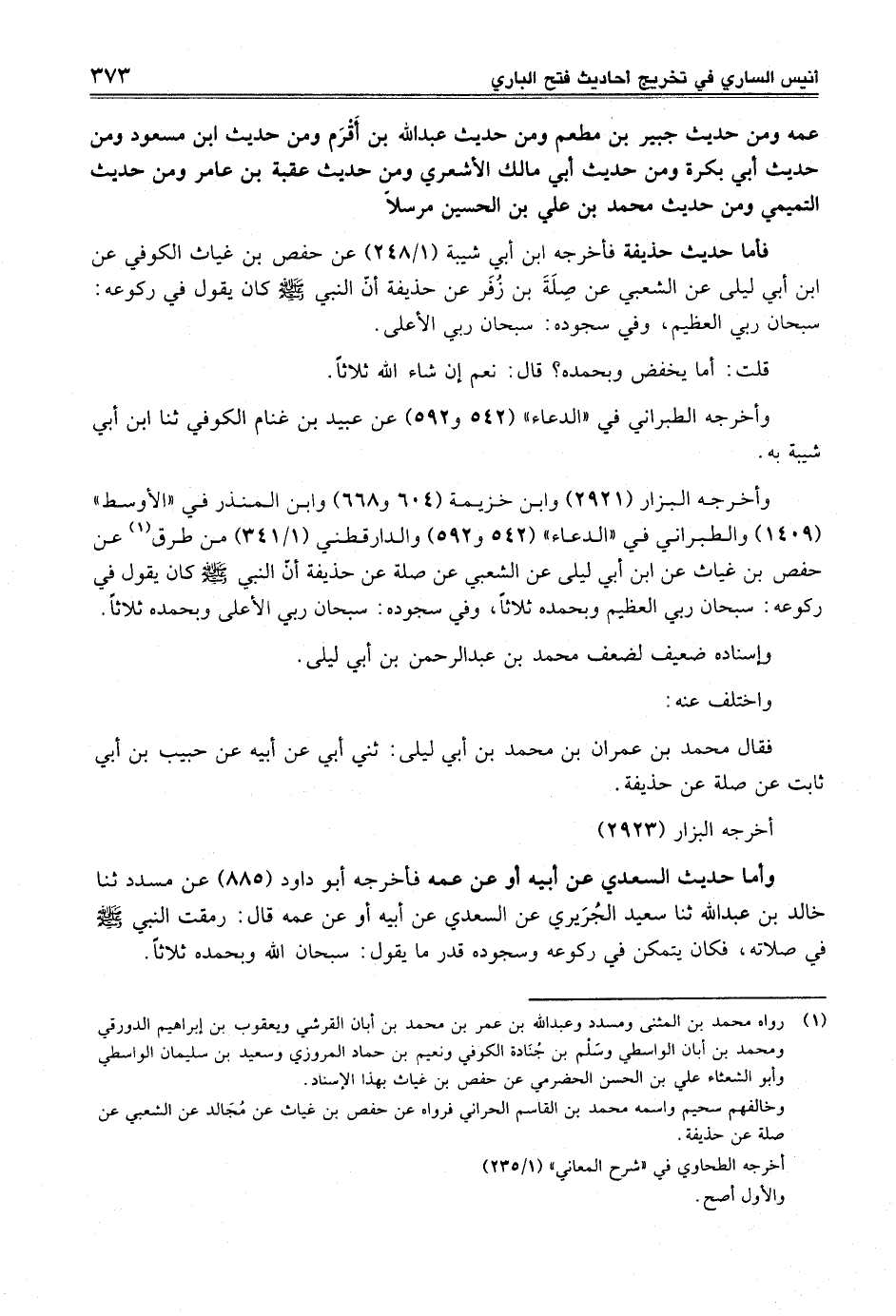 وأما حديث السعدي عن أبيه أو عن عمه فأخرجه أبو داود (885) عن مسدد ثنا خالد بن عبد الله ثنا سعيد الجُرَيري عن السعدي عن أبيه أو عن عمه قال: رمقت النبي -صلى الله عليه وسلم- في صلاته، فكان يتمكن في ركوعه وسجوده قدر ما يقول: سبحان الله وبحمده ثلاثاً.