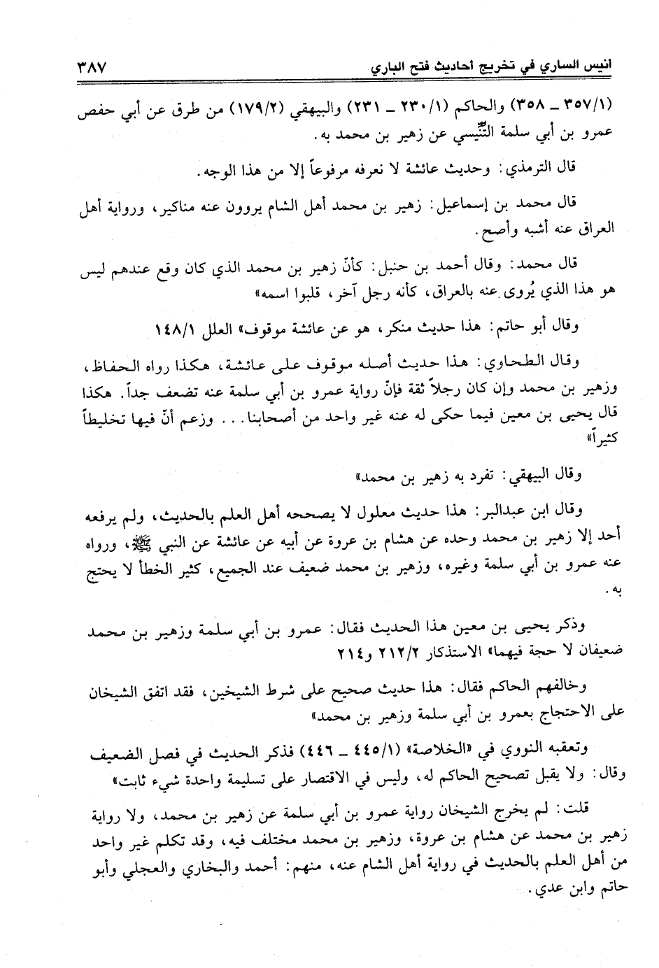 وقال الطحاوي: هذا حديث أصله موقوف على عائشة، هكذا رواه الحفاظ، وزهير بن محمد وإن كان رجلاً ثقة فإن رواية عمرو بن أبي سلمة عنه تضعف جداً. هكذا قال يحيى بن معين فيما حكى له عنه غير واحد من أصحابنا ... وزعم أن فيها تخليطاً كثيراً"