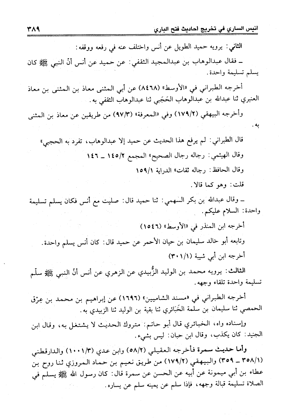 - فقال عبد الوهاب بن عبد المجيد الثقفي: عن حميد عن أنس أنّ النبي -صلى الله عليه وسلم- كان يسلم تسليمة واحدة.